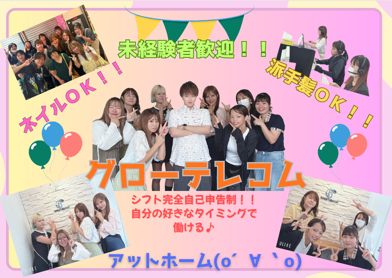 仕事内容 「大人気コスメ・サプリメントの簡単な発信業務案内」 「企業様への簡単なアポ取り業務」 「大手通販サイトの無料アカウント作成のフォロー」 トークマニュアルに沿ってお話するだけの簡単なお仕事なので 未経験の方でも安心です! ◇アピールポイント◇ ①自分の好きなタイミングで働ける! シフトが完全自己申告制なので働きたい時間に働ける! Wワークとの両立もしやすい! シフト制ではないので予定が組みやすいですよ! ②オシャレはALL自由! ロングネイルOK!派手髪OK!ピアスOK! 服装も自由だから「いつもの自分」「好きなファッション」で勤務できる! ③アットホームな環境なので働きやすい! グローテレコムスタッフは なかよし! 幅広い年齢層のスタッフが活躍中!で 明るく活発なメンバーが多く、和気あいあいと楽しい雰囲気です! ④頑張った分だけお菓子プレゼント 頑張った自分へのご褒美として… お子さんのおやつとして… 幅広いお菓子を準備しているのでスタッフから大好評!(社員も喜んでます(笑)) ⑤3カ月に1回で「飲み会」開催! 飲み食べ無料!いっぱい食べて飲みましょう!! 普段中々話せる時間がないスタッフもこの日はゆっくりお話time★ <歓迎条件> 未経験者歓迎! 経験者ももちろん歓迎! フリーター大歓迎! ママさん歓迎! 大学生歓迎! Wワーク (副業)をお探しの方も歓迎! 幅広い年齢層のスタッフが活躍中!!(女性9割の職場です)