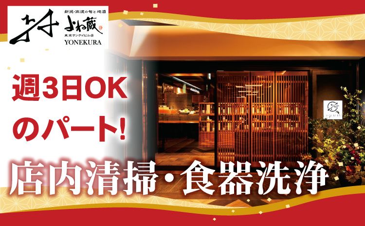 仕事内容 短時間・扶養内勤務OK!週単位のシフトなので柔軟に働けます。副業や家庭との両立にも最適! 【 お仕事のポイント 】 ・未経験・ブランクOK!丁寧な研修あり ・扶養内勤務やWワーク・副業にもピッタリ ・コツモク作業が好きな方に◎ ・土日のみ・平日のみも勤務も相談OK ・安定経営のよねグループ運営店舗 【 仕事内容 】 よね蔵 東京サンケイビル店(居酒屋)の店内の清掃と洗い場業務を行う開店準備スタッフ(アルバイト)を募集しています。調理補助としてお店のお手伝いをすることも多少あり。裏方業務に集中できるお仕事です。未経験の方も丁寧な指導があるので安心してはじめることができます。 主な業務は、 ・店内の床やホールや厨房のモップがけ、掃き掃除 ・テーブルや椅子の消毒や拭き掃除 ・店舗入口や看板などの外観清掃 ・洗い場での食器洗浄、片付け、整理整頓 ・調理補助(食材のカットや準備など) 扶養内で働きたい中高年、シニア層の方や主婦パート(主夫パート)さん、フリーター、Wワーク、副業など、シフトの⾃由度が⾼い職場で働きたい方にもおすすめです。ご経験をお持ちの方はもちろん、未経験の方やブランクがあって不安に感じている方も、1~2ヶ月の研修がございますので安心してはじめることができますよ。 美味しいまかないで、働きながらお腹も満たせるのも嬉しいポイント!さらに、お誕生日にはお店から“お食事券”のプレゼントもスタッフ想いのこうしたちょっとしたご褒美が、日々のモチベーションにつながります。 【 活かせる資格・経験(なくてもOK)】 ・掃除、清掃、早朝勤務、家事代行 ・ハウスクリーニング、客室清掃、軽作業 ・厨房、キッチン、洗い場など飲食店勤務 【 YONEKURAグループについて 】 よね蔵グループは1989年の創業以来、新潟の食材・食文化や地酒など地元生産者とのつながりを大切に、食の魅力を発信する地域活性化プロジェクトに取り組んでいます。飲食店経営をはじめ食肉小売業やカフェ事業など多角化経営で、時代とともに変化するニーズに寄り添い続け、2024年度県経済振興賞を受賞。雇用面では、独自の従業員教育システムを持ち、約830名の雇用を支えています。単身者用社宅完備でUIJターンや地方移住希望者にも柔軟な対応が可能です。 ハローワークで求職中の方や正社員のお仕事をお探しの方はもちろん、第二新卒、派遣、契約社員、Wワーク、短時間や短期アルバイト、主婦パートなどで在職・勤務中の方からの転職相談も受け付けております。 詳細や聞いてみたいことなどがありましたらお軽にご連絡ください。電話でのご応募も可能です。 TEL. 0256-64-7432(採用担当まで)