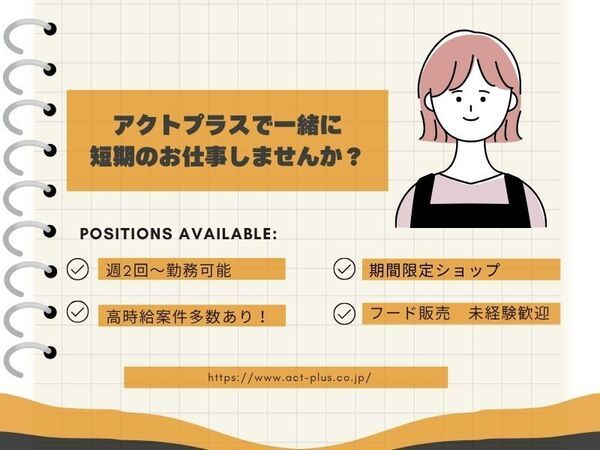 キャッチコピー <3/1~3/31> 高時給1500円!土日のみ週2勤務もOK! レジ業務なし!クッキーとなめらかキャラメルの最強コンビスイーツ☆ アピールポイント 勤務地は【海老名駅】 オンライン登録会実施中♪未経験・学生さんも歓迎! アクトプラスが短期のお仕事探しをサポートします☆ 雇用形態 派遣社員 掲載企業名 株式会社アクトプラス/apu00177 <短期>フード販売スタッフ募集 .:*☆ 1~2週間の期間限定ショップのオシゴトがメイン! フード販売のお仕事をお任せします♪ \ 短期のオシゴトはメリットがいっぱい / □ 高時給でしっかり稼げる! □働ける期間か決まっている方も安心して働ける! \サポート体制も万全 / 営業担当は全員販売経験者♪困ったことは遠慮なくご相談くださいね。 \こんな方にぜひ!! / ■食品・コスメ・衣料品などの販売・接客関連のお仕事経験がある方(レジ打ち・接客販売) ■飲食関連のお仕事経験がある方 ■接客スキル・接客マナーを活かして働きたい方 ■まずは短期で試してみたい ■ゆくゆくは長期で・・・という方も歓迎! ■サービス業の経験はあるけど、新しいこともしてみたい \こんなスタッフが活躍中♪/ ■がっつり稼ぎたいフリーターさん/主婦・主夫の方 ■子育て卒業により社会復帰・職場復帰をお考えの方 ■転職活動中の方 ■平日の授業が忙しい学生も土日祝で活躍できます! \こんな経験が活かせます!/ ■和菓子・洋菓子・惣菜や弁当販売 ■書店・ドラッグストア・家具屋・家電量販店・ホームセンター・百貨店・コスメやアパレルのブランドショップ ■飲食店(イタリアン、フレンチ、和食・洋食、中華レストラン、居酒屋、焼肉、ラーメン店など) ■コンビニ・スーパー・ファストフード店 等 企業情報(備考) 企業名:株式会社アクトプラス 運営事業部 設立日:2006/08/29 事業内容:人材派遣事業(派13-304014)、人材紹介(有料職業紹介事業:13-ユ-303575) 資本金:3,000万円 URL:https://www.act-plus.co.jp/ 採用HP https://q-mate.jp/actplusunei/index.html アクトプラス運営事業部