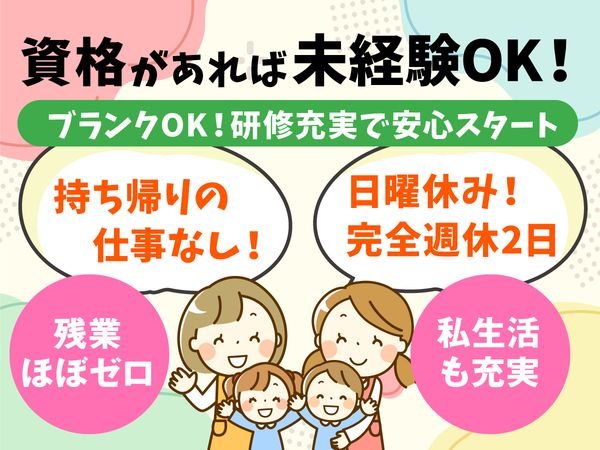 応募資格 ■応募資格(必須) ・資格:保育士資格をお持ちの方 ・免許:普通自動車運転免許(AT限定可) ・経験:未経験可/ブランク可/新卒可 ■歓迎要件 ・児童発達支援管理責任者資格 ・小学校・中学校・高校いずれかの教員免許 ・社会福祉士 ・障がい福祉施設での実務経験がある方