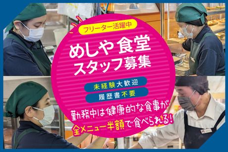仕事内容 【仕事内容】 <未経験ok♪幅広い世代のstaff活躍中☆> <食事補助あり☆メニュー全品50%off♪> <頑張りに応じて昇給あり☆> <★ホールの仕事内容★> ・レジ業務 ・テーブル拭き ・不明点がある場合はシステムのご説明 ・テーブルの備品補充 など <★めしや食堂のここがオススメ★> ・メインはレジ業務!テーブル拭き! →配膳・バッシングは1割もナシ★ お客様がセルフで食事をとって 温かい調理に時間がかかるものは 後ほどベルで呼んで取りに来てもらいます♪ その際に「お待たせいたしました!」 などを声かけをお願い致します♪ 食事後も食器返却口にお客様が 返しにこられるので テーブルを拭くのみです♪ ・和気あいあいとした店内の雰囲気! →キッチンと併設したレジなので 一人で寂しい時間などはほとんどありません☆ わからないことがすぐに聞ける環境で 未経験の方でも安心して働けます♪ ・勤務中にご飯を食べる場合、メニュー全品50%off →季節に合わせた和食が半額で食べられる! ダイエットや食事管理中・健康食に興味はあるけど コンビニ食が多い方には よりオススメの福利厚生です★