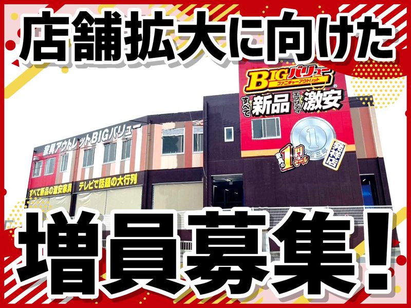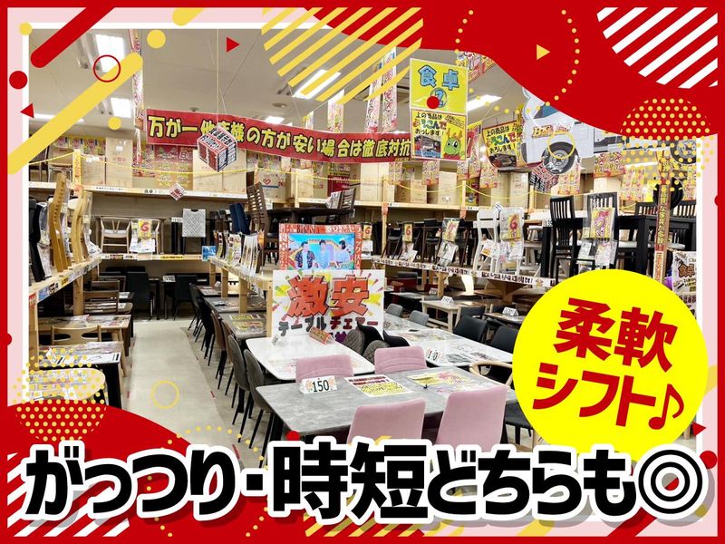 仕事内容 >>> 2026年4月頃オープン!! <<< ▶▷▶店舗拡大に向けた増員募集◀◁◀ ✅オープニングスタッフ募集 ✅土日時給UP! ✅柔軟シフト ✅週4日〜、1日8時間~OK! *-* ◆◇◆1円セールで多数テレビ出演!◆◇◆ 話題の家具アウトレット店 ~1円セールで多数テレビ出演!~ 話題の家具アウトレット店 【事務スタッフ】 ・事務作業(伝票入力、レジ対応等) ・電話対応 ・販売補助業務 必要な知識は一から丁寧に教えますので、安心ですよ♪ ==================== 4年に加古川に╲新店オープン/ 今後も店舗拡大を目標にスタッフ募集中! オシャレな家具が勢ぞろい! 見ているだけでも楽しい◎ 家具の購入は、 「部屋の模様替え」 「引っ越しで家具の買い替え」など… 常にフレッシュさを感じられます! 『飽きない』環境です♪ ==================== 【店舗の雰囲気】 一緒に仕事をするメンバーとは、常に協力しあうので気づけば仲も深まってます♪ 同じ店舗で働くスタッフは幅広い世代がいるので、色々な会話が飛び交っていて飽きない! 普段はなかなか話する機会のない世代の方もいるので、 たまにギャップに驚きながらも楽しくコミュニケーションを取ってます♪