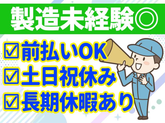 仕事内容 かんたんボタン操作のお仕事です! 機械操作が苦手な方も一度職場見学 してみませんか 以外とすぐに慣れるお仕事内容です。 <お仕事内容> 自動車部品の工場にて 機械オペレータースタッフを募集! 未経験からスタートOK! ・機械オペレーター 機械に材料をセットして機械のボタンスイッチをON! ・樹脂加工工程 加工、組み立て作業 ・検査 目視による検査作業 重いもの、難しい作業はありません。 丁寧に指導いたしますのでご安心ください。 <未経験者OK!> 工場勤務や製造業経験者はもちろん、 未経験でも活躍できるお仕事です。 重量物を持ったりすることが ほぼないので女性でも安心! <勤務地について> 角田市にある工場での勤務 車・バイク通勤OKです! 交通費の支給もあります。 <プライベートも充実> 土日祝休みなのでプライベートと 両立しながら働くことができます。 GW・夏季休暇・年末年始など 長期休暇も充実しています! <オススメPOINT> ・高時給! ・22時以降は夜間割増(1625円)でしっかり稼げる ・未経験OK ・重量物なし ・土日祝休み ・長期休暇あり ・男女活躍中! <前払いサービス有> お財布がピンチの時にも安心! 前渡し金サービスが利用できます(規定有) スマホやタブレットなどから、 24時間いつでも申請可能! 急な出費にも対応できます。 事前見学OK!電話登録OK! まずはお気軽にお問い合わせください。