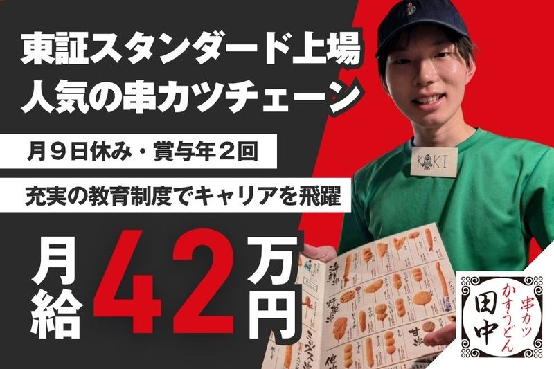 その他 アピールポイント *◇◇◆◇◇◆◇◇◆◇◇◆◇◇◆◇◇* 「100年後も生き残ると思う平成生まれ の日本企業ランキングベスト20」にて 飲食業界で唯一ランクインを果たす 人気の注目串カツチェーン店! *◇◇◆◇◇◆◇◇◆◇◇◆◇◇◆◇◇* 本場大阪の下町の味をそのまま再現した「串カツ田中」 ≪こんな方が利用されます≫ お子様連れから、仕事帰りのサラリーマンまで 多くのお客様にご来店いただき、 連日賑やかに盛り上がっています。 ≪こんなことが学べます≫ ●飲食業界で必要とされる専門知識 ●顧客満足を高める接客サービス ●店舗運営とマネジメントスキル ●マーケティングと販売促進戦略 ●衛生管理と品質コントロール ●チームワークとコミュニケーション能力 飲食の未来を共に切り拓く仲間を募集中! あなたの才能が活かせるチャンスです。 ☆★ 求職者の皆さまへ ★☆ この度は、当社の求人をご覧いただきありがとうございます。 面接ではあなたの夢、得意なこと、これまでのことなど、 ざっくばらんにお話ができたらと思っています。 お仕事No:【正社員/マネージャー候補】串カツ田中 川崎店 許可番号(人材派遣等): null