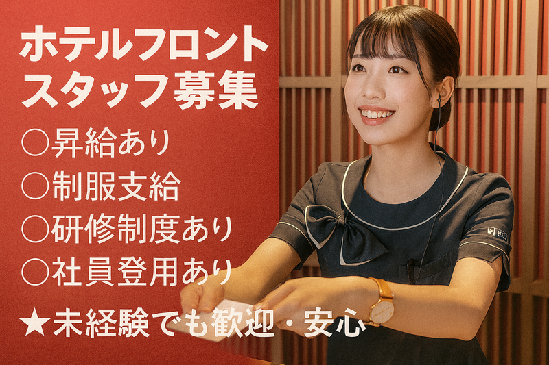 仕事内容 たびのホテル阿蘇熊本空港 ナイトフロント勤務 時給1,300円+深夜手当(22:00~05:00)|2026年4月新規オープンホテル 新規オープンホテルのナイトフロントスタッフとして勤務いただきます。 ※勤務開始時期はホテル開業に併せ、2026年4月中旬からとなります。 雇用形態:パートアルバイト 【主な業務内容】 フロント業務:チェックイン/チェックアウト お荷物のお預かり、観光案内、宿泊予約、オペレーター等 他 ホテル運営業務全般 ※入社時期は3月下旬~4月上旬となります。 様々な経験を通して、自然と成長できる環境です。 【◇勤務例】 ※シフト制(フルタイム歓迎、希望があればご相談ください) 1日あたりの実働時間:最大8時間/日 休憩:1時間 時間外労働有無:有 【◇給与】 時給:1300円~1500円+深夜手当(22時~5時) ※経験・スキルによって決定/昇給あり 深夜手当・残業手当あり 昇給あり 【◇社会保険】 各種社会保険完備(健康保険/厚生年金/雇用保険/労災保険) 【◇福利厚生】 制服貸与 社会保険あり 残業手当 深夜手当(22時~5時は深夜手当を支給いたします) 交通費規定支給(月額支給上限 40,000円) ★試用期間:3ヶ月(条件は本採用と同一) ☆★☆☆★☆☆★☆☆★☆☆★☆☆★☆☆★ ◎ホテル業界に興味があり、積極的にチャレンジしたい方(経験者優遇) ◎接客・サービスを通じて誰かの役に立ちたい方 ◎マルチタスクに抵抗のない方、変化を楽しめる方 ☆これらが当てはまる方は 自信をもって当社で活躍して頂けます♫ ☆★☆☆★☆☆★☆☆★☆☆★☆☆★☆☆★ 【サンフロンティアグループについて】 1999年に東証一部(現プライム)に上場後、安定した業績を重ね成長を続けてまいりました。 お客様目線の細やかなサービスで、「また来たい」と思わせるおもてなしの心は、国内外から高く評価されています。 「お客様と仲間のために精一杯努力する」姿勢を軸に、今後も事業拡大、成長を続ける将来性のあるグループです。 【◇応募の流れ】 書類選考→面接→内定 応募ボタンよりエントリー願います。 担当者よりご連絡します。 ☆★☆☆★☆☆★☆☆★☆☆★☆☆★☆★☆ ◎助け合い仲間のために働く社風です。若手、ベテラン問わず良い意見をどんどん賞賛し、推進する経営ポリシーがあるため、向上心があり、ホスピタリティ精神に溢れた従業員が多く活躍しています! ☆★☆職場の一つ一つの改善点を、あなたの持つ長所で大きな伸びしろに変えてみませんか? ☆★☆お客様の「ありがとう」の言葉を頂くために、共に一生懸命に働いてみませんか? ◎◎他にはない、あなただけの強みを当グループホテルで発揮して頂く事、尽くすことで得られる喜びを感じ、日々成長し、豊かになっていける事を強く願っております。