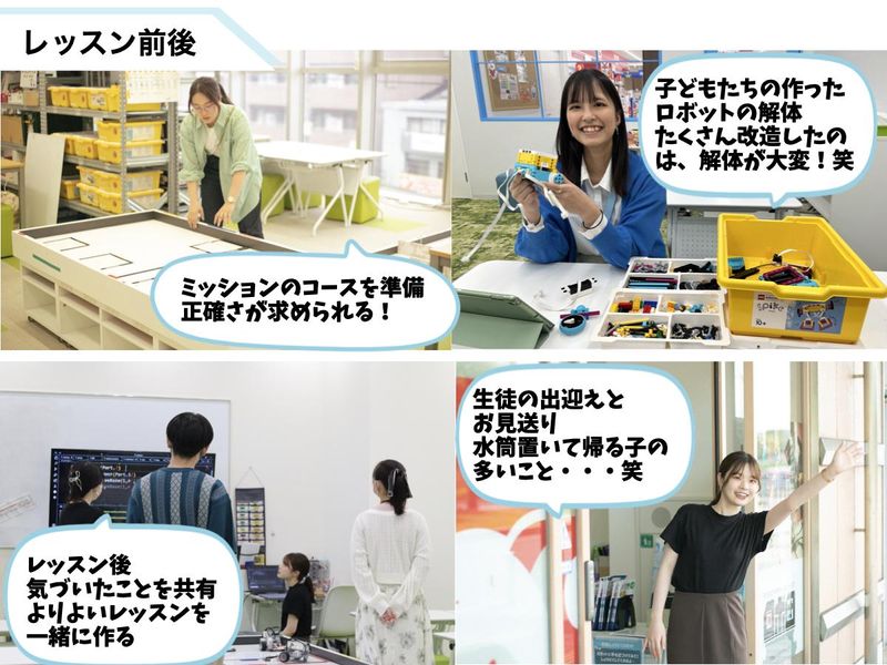 仕事内容 【仕事内容】 子どもたちのプログラミング学習支援と教室の運営に関わる業務を行っていただきます。 具体的には ・個々の進捗に合わせた学習フォロー ・レッスンの準備・片付け・講師間の情報共有 など 【ポイント】 ・<未経験から「伝える力」を磨ける> 難しいことをわかりやすく伝える経験は、将来のプレゼン力や一生モノのコミュニケーション能力に繋がります。 ・<就活で語れる「本気」のガクチカ> 主体的にレッスンを盛り上げ、子どもの成長を支援した経験は、多くの卒業生が面接で武器にしています。 ・<成長が時給に直結するライセンス制> 研修でスキルを身につけ、メイン講師のライセンスを取得すれば、最大時給1,700円までアップ可能です! 【在籍スタッフのインタビュー】 (Aさん:入社3年目、化学系大学3回生) =未経験からでも安心してスタートし、学業と両立できる環境= 私は、子どもとの接し方もプログラミングもわからない状態で始めましたが、社員さんや先輩方が丁寧に教えてくださったおかげで、とても楽しく働けています。 プログラミングを通して子どもたちの成長を見られることに、やりがいを感じます。授業では、メイン講師とサポートで連携をとりながら進行していくため、コミュニケーション力や協調性が将来に活かせると感じています。 テスト前や体調不良などの急な連絡にも柔軟に対応していただけるので、学校生活との両立もしやすいです。プログラミングが全く分からなくても安心して働けますので、ぜひ検討してみてください。 (Bさん:入社2年目、情報系大学院1回生) =子どもたちの成長を間近に感じ、自分自身も成長できる場所= ロボ団のアルバイトは、子どもたちが試行錯誤しながら「できなかったことができるようになる瞬間」に立ち会える点に、大きなやりがいがあります。最初は戸惑っていた子が、授業を重ねるうちに自信を持って取り組めるようになり、苦手なことにも前向きに挑戦していく姿をすぐ近くで感じられます。 シフトは毎月希望を出せるため、学校の予定や研究活動に合わせて柔軟に対応していただけます。学業やプライベートと両立しやすいのも魅力です。 子どもたちに教えることで、知識を噛み砕いて説明する力や、相手の理解度に合わせて工夫して伝える力が養われます。「プログラミングができないから」と不安になる必要はありません。子どもたちと一緒に考え、学びながら、自分自身の新しい発見や成長を実感できる環境です。少しでも興味があれば、ぜひ挑戦してみてください。 (Cさん:入社3年目、ロボティクス系大学3回生) =相手の立場に立って成長を支える、発見の多い毎日です= ロボ団の卒業生でもある私は、子どもたちの成長を見守ることに大きなやりがいを感じています。学習面だけでなく、ペアワークを通して協調性や思いやりが育つ姿を間近で見られるのが魅力です。 自分がかつてつまずいた経験を活かし、子どもの視点に立って例え話や体を使った説明を工夫することに面白さを感じています。「どうすれば伝わるか」を考える中で、自分は「相手の立場に立って理解を支えること」にやりがいを感じるタイプだと、自身の強みにも気づくことができました。相手に合わせて工夫して説明する力は、将来のどんな場面でも役立つと感じています。 テスト期間などは柔軟にシフト対応していただけるほか、成績のことも気にかけてくださる温かい環境です。講習や勉強会もあり、相談もしやすいため、初めての方でも安心して基礎から学べますよ。