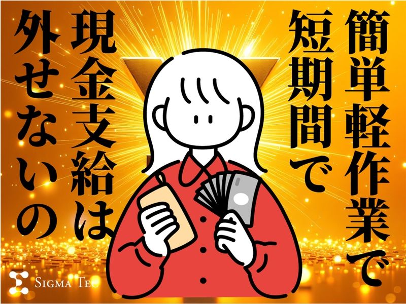 募集求人 【短期単発バイト 1/31~2/2】☆嬉しい現金支給☆日給11,000円!/ライン軽作業/2日~OK! 職種 お弁当・お寿司の具材準備 雇用形態 パート 仕事特徴 学生活躍中 主婦・主夫活躍中 未経験歓迎 経験者優遇 髪型・服装自由 バイク・車通勤OK シニア活躍中 短期・単発 履歴書不要 分煙・禁煙 募集情報 お友達や家族と一緒に歓迎!掛け持ちOK!未経験OK! / お友達やご家族を誘って 超かんたんド短期バイト! 1日11,000円のお小遣い稼ぎ! \ ご希望をお伺いしてシフトを調整させていただくため 早めのご登録ががおすすめです! ◆1/31~2/2 の合計3日間のみ 期間内の2日間勤務~OK! ◆残業なし ◆日給11,000円 ◆最終勤務日に現金支給! ◆履歴書不要 ◆即電話面接OK ◎とにかくカンタンな軽作業! ◎マイカー通勤OK ◎学生さんなど幅広く活躍中 ◎お友達やご家族と一緒に働きたい方もOK! ◎髪色、髪型自由 その他 【事業内容】 製造請負事業 労働者派遣事業 職業紹介事業 一般労働者派遣事業許可番号(派)13-050206 有料職業紹介事業許可番号 13-ユ-050168 <シグマテックで新しい働き方を見つけよう> シグマテックは、1982年創業の 人材サービス会社です。 製造業を中心に、全国の企業と働く方をつなぎ、 40年以上サポートを続けてきました。 勤務時間や期間などのご希望も伺いながら、 あなたに合った職場を 一緒に探していきます。 年代や経験は問いません。 これから新しいことに挑戦したい方も、 安心して始められる環境です。 さらに【キャリア相談窓口】を設けているので、 「自分に合った仕事ってなんだろう」 「資格を取ったほうがいいのかな」 「復職やキャリアチェンジを考えている」 そんな悩みも気軽に相談できます。 登録は最短で当日もOK。 まずはお気軽にお問い合わせください。 【代表者名】 和田 隆大 【設立】 1982年8月 関連ワード:軽作業、ハローワークで仕事探し中の方へもおすすめ