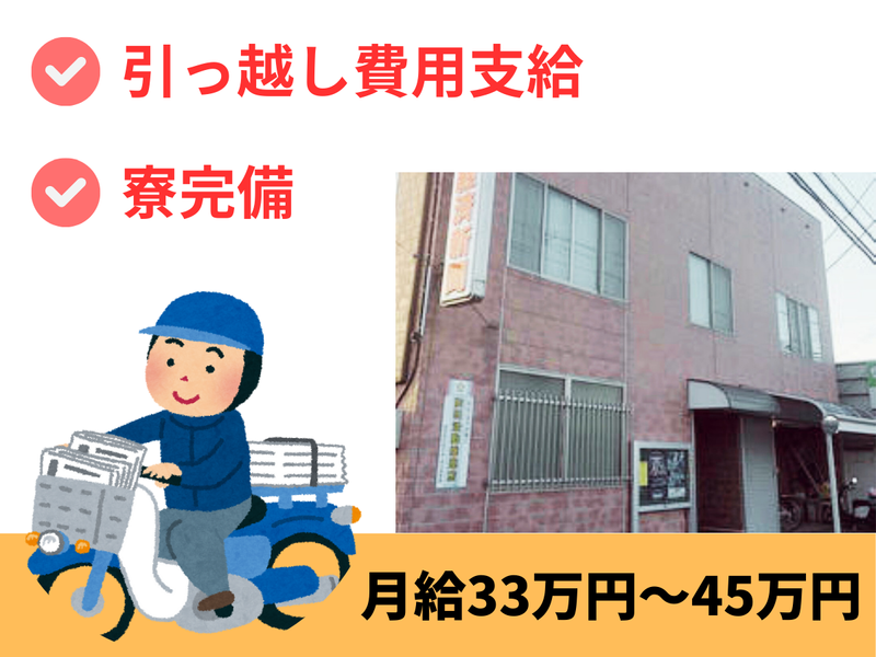 仕事内容 ●月給33万円~45万円 ●個室寮完備(家賃無料)+引っ越し費用全額会社負担 ●ノルマなし/既存のお客様対応が中心 ●接客少なめ・一人作業が多い仕事 ●未経験スタートのスタッフ多数 「貯金したい」「心機一転、新しい土地で頑張りたい」 そんな方を全力でサポートします。 - 【仕事内容】 地域の皆さまの暮らしを支えるお仕事です。 <朝夕刊配達> 担当エリアのお客様に新聞を配達します。 最初は先輩スタッフが同行して、配達ルートやコツを丁寧に教えます。 「道に詳しくないけど大丈夫かな?」という方もご安心ください。 新聞販売店専用の地図(順路帳)があるので、土地勘がない方でもすぐに道を覚えられます。 <集金業務(月末・月初のみ)> 顔なじみのお客様から購読料をお預かりします。 「いつもありがとう」と声をかけていただける、やりがいのある時間です。 <既存顧客フォロー(ノルマなし)> 契約更新のご案内や、購読状況の管理などを行います。 新規の飛び込み営業や厳しいノルマはありません。 お客様との信頼関係を大切にするお仕事です。 【1日の流れ(例)】 1:30 出勤・朝刊配達 4:30 配達終了 ↓ 日中は自由時間(睡眠・趣味・外出OK) ↓ 14:00 顧客対応・夕刊準備 16:30 夕刊配達 18:00 業務終了 ※残業はほとんどありません - 1. 未経験からでも安心!あなたの挑戦を全力でサポート  ̄ ̄ ̄ ̄ ̄ ̄ ̄ ̄ ̄ ̄ ̄ ̄ ̄ ̄ ̄ ̄ ̄ ̄ ̄ ̄ ̄ ̄ ̄ ̄ ̄ ̄ 現在活躍中のスタッフも、ほとんどが未経験からスタートしました。 配達のコツからお客様との接し方まで、あなたのペースに合わせて丁寧に教えます。 新聞販売店専用の地図(順路帳)があるので、地理に詳しくない方でも安心して始められます。 2. 貯金も夢じゃない!新生活を家賃負担なしでスタート  ̄ ̄ ̄ ̄ ̄ ̄ ̄ ̄ ̄ ̄ ̄ ̄ ̄ ̄ ̄ ̄ ̄ ̄ ̄ ̄ ̄ ̄ ̄ ̄ ̄ ̄ 「新天地で心機一転頑張りたいけど、初期費用が心配…」。 そんなあなたの不安を私たちが解消します。 個室寮完備はもちろん、引っ越し費用も全額会社が負担します。 住まいにかかる費用を抑えられるので、その分を貯金したり、自分のために使うことができます。 3. 頑張りをしっかり評価!安定収入で将来も安心  ̄ ̄ ̄ ̄ ̄ ̄ ̄ ̄ ̄ ̄ ̄ ̄ ̄ ̄ ̄ ̄ ̄ ̄ ̄ ̄ ̄ ̄ ̄ 基本給に加えて、頑張った分は歩合として給与に反映されます。 入社1年目から月収33万円も可能なので、安定した収入を得られます。 さらに、退職金制度や大型積立金制度など、将来の夢を叶えるためのサポートも充実しています。 4. 自分の時間を有効活用できる!  ̄ ̄ ̄ ̄ ̄ ̄ ̄ ̄ ̄ ̄ ̄ ̄ ̄ ̄ ̄ ̄ 早朝に配達を終えた後、日中は自由な時間がたっぷりあります。 趣味や勉強、家族との時間など、プライベートを大切にしながら働けます。 日中の銀行や病院、役所の手続きもスムーズに済ませられます。
