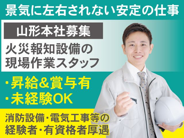仕事内容 <注目ポイント> ・長期安定の正社員募集 ・経験不問、未経験者歓迎 ・先輩スタッフの同行ありで安心 ・残業ほぼなし ・昇給・賞与・退職金制度あり <お仕事内容> 主に火災報知設備の施工及び、保守点検業務を行う、 現場作業員のお仕事をお願いします。 安定した正社員のお仕事です。 火災報知機は、いざという時に、お客様の生命と財産を守る設備です。 皆さんの安全と安心を守るお仕事です。 ・施工 新築物件での火災報知機の取り付け作業 ・保守点検 定期的な動作状況の確認や、消火器等の点検業務となります 先輩社員と同行し、ひとつひとつ丁寧にお仕事を指導してまいります。 イチから指導することで、いずれ経験を積んでいただいたら ペアのリーダーとして、後輩社員の育成など新人教育もお願いします。 <ここがポイント> 経験不問 未経験歓迎 安心のフォロー体制 現場へは基本的に「2人1組」で向かいます。 先輩スタッフが業務を教えてくれるので、 消防設備・設備管理などが未経験の方も安心してください。 残業ほぼなし!プライベートも充実! 主な現場が公共施設や企業様のビルになります。 施設の営業時間内に作業をするため、残業がほとんどありません。 働きやすい日勤帯での勤務で土日祝休みの他、長期休暇もございます。 プライベート時間もしっかり確保できます! ※土曜日は隔週休み 景気に左右されない安定した仕事! 消防用設備は規模や用途により設置や定期的な点検が義務付けられています。 その為、一定の仕事量が確保されており、お仕事が安定しています。 不景気にも強い会社です! <こんな方にオススメ!> ・建設業でのお仕事に興味がある方 ・設備管理や電気工事などの経験を活かしたい方 ・現場作業など、作業員としてカラダを動かすことが好きな方 前職で設備管理や施設管理の経験をお持ちの方や 通信工事や設備工事の業務に携わっていた方は、 これまでの経験やスキルを活かして働いていただけます。 消防設備、電気工事等の経験者・有資格者は厚遇いたします! 異業種からの転職者もお待ちしております! 【1日のスケジュール(例)】 ・8:00、全員集まって朝礼。 ↓ ・2人1組の班ごとに現場へ向かう準備。 作業道具などをカクニン。 ↓ ・現場へルートの確認&車で出発! ↓ ・現場到着。施設担当の方へご挨拶。 ↓ ・作業開始。 ↓ ・昼食をはさんで別の現場へ。 ※広い施設の場合は丸一日同じ現場のことも ↓ ・午後の作業開始。 ↓ ・作業終了。17:00頃帰社。 ↓ ・報告書を作成し、17:15退勤。 お疲れ様でした。 <その他> 女性も可能な業務でありますし、体を動かす仕事が好きな方にオススメです。 弱電設備(放送設備・テレビ共聴設備・インターフォン設備)の施工業務もあります。