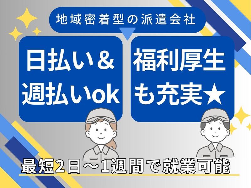 【保険制度】 雇用保険、労災保険、健康保険、厚生年金 待遇・福利厚生 【福利厚生】 ✅交通費支給(規定) ✅日払いOK(規定) ✅週払いOK(規定) ✅髪型・髪色自由 ✅服装自由 ✅休憩室・ロッカー完備 ✅食堂あり ✅バイク・自転車通勤可 ※駐輪場あり