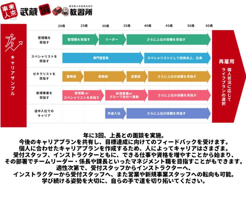 アピールポイント: ーーーーーーーーーーーーーーー 「お客様の一生の思い出創り」 ーーーーーーーーーーーーーーー 自動車教習所の仕事は、 ≪人と接すること≫がメイン! 「誰かの役に立ちたい」 「人を笑わせることが好き」 「教えることが得意」など あなたのコミュニケーションスキルを 存分に活かせます! Q.運転や車の知識がなくても大丈夫? A.事前の知識や技術は全く問題ありません! 当社は業務中に資格取得のための勉強時間を しっかり設けています。 運転練習も先輩スタッフが付き添いながら、 全面的にバックアップします◎ ☆武蔵境自動車教習所の魅力☆ ✓若手から活躍できる環境! ✓産休・育休制度・復帰後の時短勤務も可能 ✓他部署との交流も活発◎ ✓実績や能力をしっかり評価 年齢関係なく、キャリアアップを目指せます!