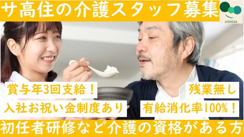 【仕事内容】 賞与は年3回!有給消化率100%の サービス付き高齢者住宅の介護スタッフ募集! 【三重県から“三ツ星”認定!】 エミタス株式会社は、三重県が推進する「働き方改革推進企業認定制度」において、最上位ランクの“三ツ星”認定を受けた福祉事業者です。 この認定は、柔軟な働き方・ワークライフバランスの実現・職場環境の整備などの取り組みが高く評価された証。 子育てや介護との両立、ライフスタイルに合わせた働き方を応援しています! ■サービス付き高齢者住宅内での訪問介護業務 ・身体介護・生活援助 ・サービス付き高齢者住宅にお住いの利用者様の入浴、食事、掃除、買い物 などのお手伝い。 ・訪問介護ですが、施設内のみなので移動などはありません。 ※有給消化の希望日は100%通します。 ■働くスタッフの1日の流れ <午前中> 6:00起床介助 7:00朝食介助 8:00排せつ介助・デイサービスへの送り出し 9:00 朝礼・ 排せつ介助 10:00 入浴介助・ 掃除支援 おやつ介助 12:00昼食介助 <午後> 13:00口腔ケア・排せつ介助 14:00 入浴介助 ・ 掃除支援・ おやつ介助 17:00夕食介助 18:00 排せつ介助・口腔ケア 20:00 就寝介助 ※個々に合わせた業務になりますが、1日の業務のイメージです 【働きやすさ×自分らしく活躍できる環境が整った職場です】 エミタスでは、職員一人ひとりのライフスタイルや価値観を大切にし、「休みやすい・働きやすい職場づくり」に取り組んでいます。 子育てや介護など家庭の事情に応じた勤務調整や休暇取得にも柔軟に対応しており、男女問わず安心して長く働ける環境を整備しています。 女性が管理職としても活躍しており、多様なキャリアを築ける職場です。 さらに、若手の意見やチャレンジも積極的に取り入れ、「やってみたい!」が実現できる風土が根づいています。 SNS発信や自社ホームページ運営など、広報活動にもスタッフが主体的に関わっており、働く喜びを広げています。 まずは見学だけ、お問い合わせだけでも大歓迎です。 ご応募・ご連絡お待ちしております。 【求人ID-EMT01】