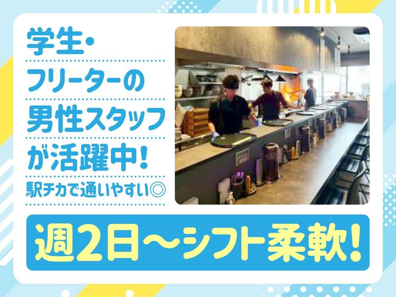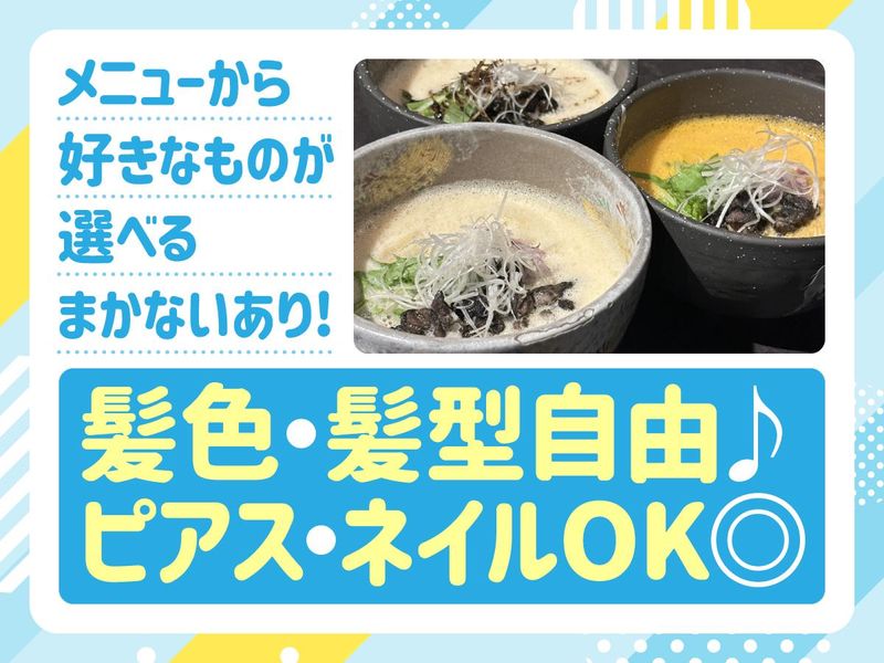 仕事内容 \オープニングスタッフ大募集!/ ✅ 2週間ごとのシフト提出で予定が組みやすい! ✅ 学校終わりの夕方バイトも歓迎! ✅子どもが帰る15時まで等で働ける! ✅ 髪色・ピアス・髭OK!おしゃれも楽しめる! ✅オープニングだから上下関係なし! ✅ まかない無料♪メニューから好きなラーメン選べる! ラーメン屋さんでの接客・調理補助をお任せします★ 食券制なので、オーダーの取り違えもありません! 【具体的には】 ・ 食券を受け取って注文確認 ・キッチンにオーダーを伝える ・お料理を運ぶ(配膳) ・食器の洗い物等 まずは基本の流れを覚えるだけ! 慣れてきたら盛り付けなどもお任せします! 今回は新店オープンに伴う募集なので、 上下関係は一切なし。 全員同期!みんな同じスタートです! イチからお店を盛り上げませんか? 「バイト初日は緊張する…」という人も、みんな同期だから安心! 店長(男性)は30代と若いので、 大学生活の悩みや就活の相談、 お子さんの話や趣味の話など、 何でも話せるフランクな雰囲気です◎ - \オススメポイントをご紹介♪/ - ★2週間毎シフト制で予定の立てやすさ◎ →曜日固定シフトでも希望シフト制でも どちらでも大丈夫! シフトの融通も利く働きやすい職場◎ ★まかないあり! →メニューから好きなものを選べます! ★おしゃれを楽しめる! →髪色・髪型自由!ピアスOK・髭OK! 個性を大事にあなたらしく働けます! - \姉妹店では学生・主婦活躍中!/ - 実際の働き方をご紹介!! ●大学生スタッフ 例:18:00〜22:00 ┗授業が終わってから出勤! 学業やサークルを優先しながら、 無理なく続けられる♪ 「飲食バイトが初めてでも先輩スタッフが丁寧に教えてくれて安心です! 学校やプライベートと両立しやすくて、働きやすいです!」 ――男子大学生スタッフ ●主婦パートさん 例:11:00〜15:00 ┗子供を送り出した後に出勤し、 帰宅時間に間に合うように退勤! 夕飯の支度も余裕をもってこなせます◎ またWワークで夜から働きたい!などの パートさんも歓迎です! 「家から近く、子供が帰る時間までの 短時間勤務で働けるので働きやすいです! 食券制なのでオーダーでバタつくことも ないです!」 ――主婦スタッフ