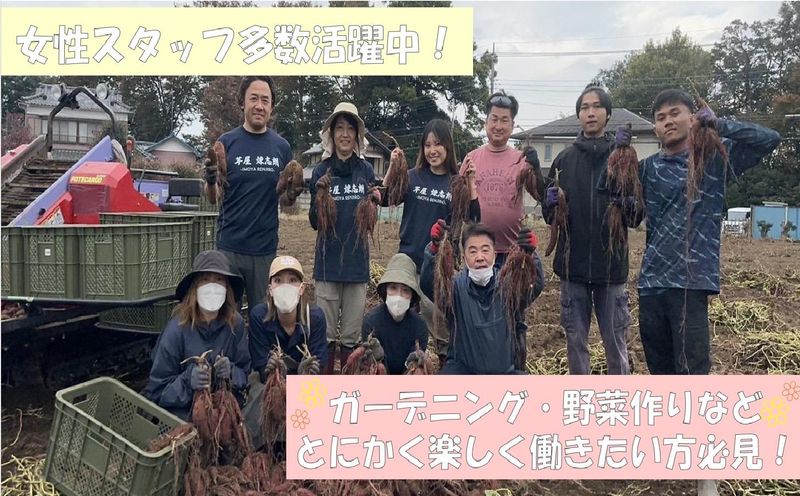 仕事内容 。・:*:・。・:*:・。 。・:*:・。・:*:・。 ✨ダイエットや美容の味方! サツマイモの農作業・企画 広報宣伝・園芸用土製造スタッフ 大募集✨ 。・:*:・。・:*:・。 。・:*:・。・:*:・。 当社の畑でこだわりを持って作っているサツマイモの 製造過程・出荷作業などを楽しみながら、たくさんの人に 当社の存在や製品を知って頂くためのお手伝いをお願いします! もちろんあなた自身も土に触れて、製造過程を 手伝って頂きながら、その喜びや苦労を世の中に発信して頂きたいです! 当社がメインで扱っているのは 用土や肥料など、園芸に関わる商品です。 あなたの目を楽しませる美しい植物、その命の源となる、 それが当社が扱っている園芸用土を施設内で作っており、 こちらの構内作業のお仕事もお願いします。 また園芸関係の催事などのお手伝いを お願いすることもあり、仕事の幅が広いのも 当社の魅力です! 当社の薩摩芋は当社で製造した園芸用土や肥料を使用して おり、これが大好評で当社の二本柱の事業として、 ただいまぐんぐん成長中となっています。 そして手塩にかけて製造したサツマイモを使った 新商品も今後登場予定です! それに伴い、薩摩芋の農作業・干し芋の製造作業をお願いします。 また新商品の販売に向けた、薩摩芋事業部において 商品開発・販売企画・SNSを使ったPR活動の支援もお願いします。 サツマイモ好きな女性が多数活躍中! 毎日楽しくイキイキと働いてくれています(^^♪ ୨୧┈┈┈┈┈ପ✩⃛ଓ┈┈┈┈┈┈୨୧ 自然豊かな見沼区での健康的な農作業のお仕事です。 一部、植物肥料の構内作業もあります。 自然の力と人の手で作る干し芋作りは、 時間も手間もかかりますが、 おいしさを形にしたい想いで一生懸命作っています。 収穫してすぐに干し芋を作成するのではなく、 1ヶ月以上の熟成期間を経て、 製造に入っていきます。 皮剥き、裁断、乾燥 といった工程を経て薩摩芋が干し芋へ。 一生懸命手をかけた薩摩芋が 干し芋へ変わっていく瞬間を一緒に見届けてくれませんか? 植物や野菜製造、農作業が好きな方、 にもピッタリのお仕事です。 今年も6種類の品種を生産しています♪ ୨୧┈┈┈┈┈ପ✩⃛ଓ┈┈┈┈┈┈୨୧ 【経験一切不問!】 経験や知識は全く問いません! ⭐ガーデニングが好き! ⭐食べることが好き! ⭐未経験から挑戦したい! そんな方大歓迎です! しっかりフォローしますのでご安心ください♪ ୨୧┈┈┈┈┈ପ✩⃛ଓ┈┈┈┈┈┈୨୧ 【社員想いの社長!】 「子供が熱を出している!?だったら早く帰って、 子供を看病して、奥さんを手伝ってやれ!」 って社長が言ってます。 当社が提供するのは 園芸を通じて得られる 「当たり前の中の幸せ」。 「おうち時間」を大切にする社会環境から ガーデニングや自家栽培の需要が高まっています。 現在在籍するスタッフは既婚者も多く、 家庭と両立しながら働く人が多数。 日勤のみの無理ない勤務だからこそ。 管理職の私も子供が3人いますが、 可愛い笑顔を守ることが一番の仕事。 それ以上に優先される仕事ってある? それが当社の自慢でもあり僕の自慢です(笑)