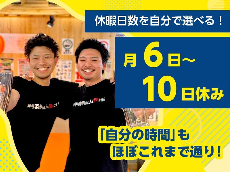 仕事内容 「ずっと今のままでいいのかな」 …そんな不安、ここで終わりにしませんか? 「正社員になりたいけど、 自由がなくなるのはイヤ」 「フリーターの自分って ちゃんと評価してもらえるのかな」 こんな風に思ったことはないですか? “これまで通り”のあなたのままで、 働き方は大きく変わらずに。 そして、これまで頑張ってきた 時間も経験も、 決してムダにしないように。 全国に『酔っ手羽』を展開するS.H.N株式会社は、 今までやってきたことを評価して、 あなたを「正社員」として迎えます!  ̄ ̄ ̄ ̄ ̄ ̄ ̄ ̄ ̄ ̄ ̄ ̄ ̄ ̄ ̄ ̄ ̄ ̄ ̄ ✅「正社員=休めない」はもう古い! 「自由な働き方」は、正社員でも同じ。 当社なら、月6〜10日の間で、 【自分で】休日数を選択可能です! 6日休みでガッツリ稼ぐ人もいれば、 10日休んで趣味優先の人もいます。 もちろん有給取得だって当たり前。 連休もOKです。 “ちゃんと休める”からこそ、 仕事にも100%の力で向き合えます! ✅「頑張り」は給与に反映 ・忙しくても手を抜かない ・周りを見て動く ・新人に声をかける ・ドリンクもホールも どっちも回す こういうこと、 今まで普通にやってきていませんか? こんな“当たり前”のことも 当社では評価の対象! もちろん評価は、 年3回ある【昇給チャンス】で 給与にしっかり反映。 ちゃんと変わっていく実感があります。 実際に未経験で入社した後、 コツコツ続けて給与アップした人も! 数字だけじゃなく、 “普段の動き”も見ている会社です。  ̄ ̄ ̄ ̄ ̄ ̄ ̄ ̄ ̄ ̄ ̄ ̄ ̄ ̄ ̄ ̄ ̄ ̄ ̄ ■仕事内容 ✅お客様のご案内 ✅オーダー対応 ✅料理・ドリンクの提供 ✅簡単な調理・盛り付け ✅片付け・清掃 など まずはお客様のご案内やオーダー対応など、 できることからお任せします。 「包丁を握ったことがない」 「接客は初めて挑戦する」 なんて先輩たちも、 今では店舗を支える中心メンバー。 一歩ずつ成長していきましょう! ■「酔っ手羽」とは? 昭和レトロな懐かしさと、 現代的な活気が絶妙に混ざり合った 独自の空間。 それが「酔っ手羽(よってば)」の 大きな特徴です。 マニュアル通りの無機質な接客ではなく 目の前のお客様を笑顔にするための 「遊び心」を大切にする社風だからこそ、 スタッフ一人ひとりの個性が お店の味になります。 そんな活気ある現場で、 あなた自身の個性を活かしながら、 お客様と一緒に最高にハッピーな空間を 作り上げていきましょう。 ■仕事も、遊びも、全力で! 忙しい時間帯は、自然と 声をかけ合いながら回しています。 困っている人がいたら フォローするのが当たり前! 一人で抱え込むことはありません。 みんなで全力で頑張ったら 年に一度の社員旅行へ! 毎年沖縄に行って 海やBBQなどを楽しんでいます。 普段は真剣に仕事をして、 遊ぶときは思い切り遊ぶ! だからこそ、 「このメンバーと、また来たい!」 「来年も行くために、頑張ろう!」 そう思える関係性が、 自然とできています。  ̄ ̄ ̄ ̄ ̄ ̄ ̄ ̄ ̄ ̄ ̄ ̄ ̄ ̄ ̄ ̄ ̄ ̄ ̄ 未経験でも、自分に自信がなくてもOK! ✅頑張りが評価されて、 給与に反映される ✅休みもしっかりある ✅チャンスが多い ✅仕事も人生も楽しめる そんな環境で、 新しいスタートを切りませんか?  ̄ ̄ ̄ ̄ ̄ ̄ ̄ ̄ ̄ ̄ ̄ ̄ ̄ ̄ ̄ ̄ ̄ ̄ ̄ <<S.H.Nで働くメリット>> ✅ピアス・染髪・ネイル自由の正社員! ✅全国600店舗展開の安定成長企業◎ ✅住宅手当・まかないなど福利厚生充実♪ ■充実の福利厚生でバックアップ♪ ✅昇給年3回 ✅賞与年2回 ✅インセンティブ制度 ✅月最大10日休み ✅引越手当(1律10万円)※規定あり ✅住宅手当(1律2万円支給)※規定あり ✅社内レクリエーション ✅独立支援制度 など ■キャリアの“詰まり”がない S.H.Nは、全国に続々と 新店を展開する成長企業! 今年の出店計画は30店舗以上です。 新しいお店ができる = 新しいポジションが生まれる = チャンスが増える! 未経験入社3年で店長になった社員も! 「年齢」や「社歴」よりも、 行動した人にチャンスが回ります。 ■実力に応じてキャリアアップ 店舗運営を一通りマスター、その後は… 実力を正当に評価して昇格・昇給に反映! ◇副店長:月給33万円~35万7000円 ◇店長候補:月給36万円~38万円 ◇店長:月給40万円~ ◇エリアマネージャー:月給45万円~50万円  ̄ ̄ ̄ ̄ ̄ ̄ ̄ ̄ ̄ ̄ ̄ ̄ ̄ ̄ ̄ ̄ ̄ ̄ ̄ ⭐いきなり正社員が不安な方は、 1週間の「お試し体験入社(時給制)」から 始めることも可能です。 まずは一度、あなたのこれからのことを お話ししませんか?
