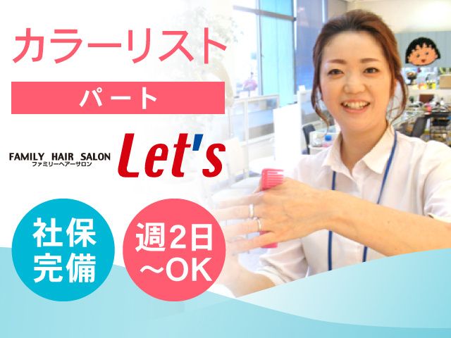 仕事内容 《 パート 》カラーリスト募集! 未経験・ブランクOK! あなたのスケジュールに合わせて 無理なく勤務できます! ブランクがあってもご安心ください。 ブランクから復帰されたスタッフが 多数している美容室が【Let's】です! もう一度美容師としてスタートしませんか? /////// POINT ///////// ◎週2日~勤務OK! ◎1日4H~OK!時短勤務も可能! ◎5年~10年のブランクからの 美容師スタッフが当社で 多数復帰して活躍しています!! ◎入社前の事前研修があり安心! ◎扶養範囲内OK! ◎主婦(夫)さん、 子育てママさん活躍中! ◎40代、50代、60代の 中高年、ミドル世代活躍中! ◎カラー、シャンプーのみOK! ◎残業なし! =============== ・社会保険完備 ・有給休暇年間12日間(月1日程度) ・・・など、福利厚生充実! なので、在籍年数10年以上のスタッフが、 300名中120名以上! 創業40年、信頼と実績のある企業 株式会社ユーアンド・美容室レッツで 長期に安定してお仕事しませんか。 =============== <募集職種> パート/美容師(カラースタッフ) <仕事内容> カラーやシャンプーなどを メインとした施術をお願い致します。 カラー・シャンプー専門なので パーマやカットは一切ありません。 1日4時間から勤務可能なので 短時間から勤務できます。 また、オートシャンプーを導入しているので 手荒れや腰痛、体の不調などで 断念した方も安心して働ける環境です。 <予約制・指名制なし> 予約や指名中心の店舗ではありませんので、 たくさんのお客様に入客するチャンスがあります。 受付もあるので個々の負担が少ないのも魅力です。 〈 安心のサポート・教育体制〉 現在活躍しているスタッフは 【5年以上/6割・10年以上/4割】 ブランクから復帰している実績有り! 配属前に本部研修を実施しています。 技術教育動画も充実していますので、 安心して現場に復帰可能です! また、店舗での日々の研修の他に、 希望者のみ、 ・本部でのカット講習 ・インストラクターによる、 ワインディングやカラー塗布などの 講習も実施しております。 < 40歳以上の方も多数活躍中! > 長く現役で働けるのも魅力の一つ。 年齢不問で活躍できます! 30代・40代の女性を中心に 20代~50代・60代まで幅広く活躍。 勤続10年以上のスタッフが 約120名在籍しています(2024年3月現在) 〈お客様の客層について〉 白髪染めメインのご来店も多く、 シニア世代の方々にも多数ご来店・ ご好評いただいています。 (65歳以上/30%、お子様/30%) < 日数・時間の相談のOK > ご家庭や育児を優先して働けるよう、 都合にあわせてお仕事可能です! 周りには同様の境遇のスタッフも いるので、協力体制もバッチリなので 安心してお仕事ができます。 〈将来的にステップアップ可能〉 カラー専門のスタートでも 希望があればカラーだけでなく、 アシスタント、スタイリストへの お仕事チェレンジもOK! 新たなステップへスキルアップももちろん可能! ・・・・・・・・・・・・・・・・・・・・・・・・・・・・・・・・・・・ ハローワークで探してるけど なかなかみつからない… 時間の融通がきく働き方をしたいなど まずはお気軽にお問合せください! ・・・・・・・・・・・・・・・・・・・・・・・・・・・・・・・・