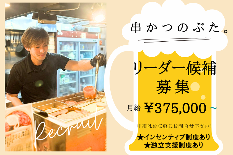 仕事内容 *・*・*・*・*・*・*・*・* 月給37.5万円~×リーダーを育てる会社 <<レイリーフードテック>> × <<串かつのぶた。 いわき駅前店>> 次のキャリアをつかむ “店舗リーダー候補”募集! *・*・*・*・*・*・*・*・* \レイリーフードテックで働くポイント/ ★ 全員インセンティブ制度 → チームで成果をわかちあう文化 ★ “役職ではなく役割”を重視する、 人が育つ組織 ★ キャリアステップ明確 → 一般→店長→SV→部長→独立も ★ 飲食×マーケ支援の多角経営 → 成長性と安定性の両立 ★ 独立支援制度あり (店長経験3年~、資金含め伴走) ··—··—··—··—··—·· 【仕事内容】 現場の中心となり、オペレーションや 接客品質を引っ張るポジションです。 ◆お客様のご案内・接客 ◆料理・ドリンク提供 ◆調理・工程の品質管理 ◆フロア全体の指揮・動きの最適化 ◆新人育成・教育の中心役 ◆営業中の判断・トラブル対応 ◆店長・副店長と連携した改善提案 など テンポの良い接客とチームワークが 求められる現場だからこそ、 「現場をまわす力」と「人を巻き込む力」 を磨けるポジションです。 ··—··—··—··—··—·· 【レイリーフードテックってこんな会社!】 代表の飯田・村上は、 元々同じ飲食企業で働いていた仲間。 「自分たちの力で、お店や人の未来を つくれる会社をつくりたい」 その想いから、2022年に レイリーフードテックを創業しました。 掲げたミッションは “ライズリーダー(リーダーを輩出する)”。 ★ 役職ではなく「役割」で評価する ★ 人が育てば、会社は強くなる ★ 「入ってよかった」と胸を張れる職場にする この価値観を軸に、 評価・研修・キャリア制度のすべてが “人を育てるため”に設計されています。 現在は、水戸・つくば・いわきにて 6店舗を展開。2036年に100店舗、 上場を目指し、拡大中です。 さらに、私たちは “飲食だけの会社”ではありません。 SNS運用支援、 マーケティング支援などの事業も行い、 地方企業が「勝てる仕組み」を つくる力にもなっています。 そして今、より大きな成長を見据え、 グループ会社 「レイリーホールディングス」を設立。 今後は M&Aを含め、飲食以外の 領域にも挑戦していきます。 “数字にコミットする”プロの視点と、 “想いや理念に寄り添う” 人間的な関わりを両立させながら、 地域から挑戦する人と企業を 増やすことを目指しています。 → 飲食×人材育成×マーケ支援 を軸にした多角展開のため、 会社としての成長性・安定性が 両立しているのが大きな強みです。 ··—··—··—··—··—·· 【展開ブランド】 ・串かつのぶた。(自社業態) ・0秒レモンサワーときわ亭(FC) ・鮨酒肴 杉玉(FC) 【『串かつのぶた。』について】 大阪のソウルフード「串カツ」を 気軽に楽しめる、自社オリジナルブランド。 素材・衣・揚げ油に徹底してこだわり、 看板メニューの【のぶた名物】 リブロース仕込みの極みぶた串かつ は、 肉の旨みと衣の軽さが絶妙にマッチした自信作です。 効率的な導線設計により、 スタッフの負担を減らしながら スピーディーな提供を実現。 ホール・キッチンが一体となり、 チームでお客様を楽しませる空間です。 「もっと自由にアイデアを出したい」 「自分の力で店を動かしてみたい」 そんな想いをカタチにできる環境があります。 ··—··—··—··—··—·· 【ここが魅力!】 ◆ 評価は“リアルタイム推薦制” SV・店長が日常での成長を見て、 必要なタイミングで昇格を推進。 ◆ インセンティブは全員対象 個人戦ではなく“チームで勝つ”文化。 ◆ 育成に強い会社 数字管理・マネジメント・ リーダーシップなど“店長で終わらない人材” をつくる研修体制。 ◆ キャリアステップが明確で速い 一般 → トレーナー→マネージャー → 主任 → 副店長 → 店長代行 → 店長 → リーダー → SV → 部長 + SNSマーケチームの道にも挑戦可能 ◆ 実績 ・副店長入社 → 2ヶ月 で店長代行 ・店長入社 → 約1年 でSV昇格 ◆ 独立支援あり(店長3年〜) 資金/計画/運営ノウハウまで伴走。 特に 「串かつのぶた。」は独立モデルとして相性◎ ◆ 待遇面もしっかり ・昇給あり ・決算賞与(業績による) ・全員インセンティブ ・家族手当 (子ども1名につき1万円) ・まかない ・資格取得支援 (衛生/防火管理者など会社負担) ・ネイル・髪型自由 ・車/バイク通勤OK(駐車場あり) ··—··—··—··—··—·· 「仲間と店をつくる。 自分の力で未来を切り開く。」 レイリーフードテックは、今まさに拡大期。 新しい店舗・新しいポジションが 次々と生まれているため、 “役職の空き待ち”はありません。 実際に、入社数ヶ月での昇格や 、店長 → SV へのスピード昇進も多数。 その背中を見て、“アルバイトから社員へ” チャレンジしたメンバーもいます。 “誰かの活躍が、次の挑戦を生む”。 そうやって、 成長の連鎖が続いている会社です。 その面白さを、 ここで一緒に味わいませんか? 応募はお早めに◎
