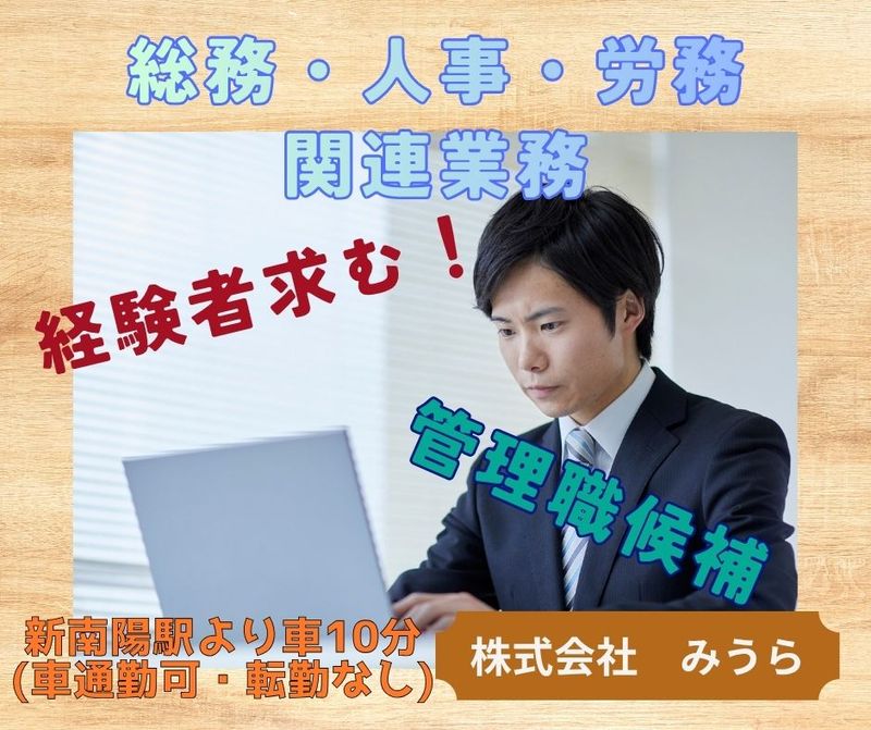 メッセージ 〇〇〇〇〇〇〇〇〇 男性スタッフ活躍中! 将来的には 「管理職のポジション」を お任せする予定です 〇〇〇〇〇〇〇〇〇 そのため、今までに 「総務・人事・労務関連のお仕事」を 経験された方のご応募お待ちしています ※現場でのお仕事はありませんので ご安心ください! ◆――――――――――◆ 株式会社みうらは 木と共に歩み続けて、 2026年で創業99年を迎えます ◆――――――――――◆ ☆こちらのお仕事は、 企業様からお預かりし 転職エージェント『しごと計画学校』が ご紹介するお仕事です 『しごと計画学校』については 下記「その他欄」に記載しておりますので ご参考ください 総務・人事・労務スタッフ募集!男性活躍中/経験者のみ/管理職候補会社を支える誇りです! 職業紹介事業(35-ユ-300085) 労働者派遣事業(派35-300431)