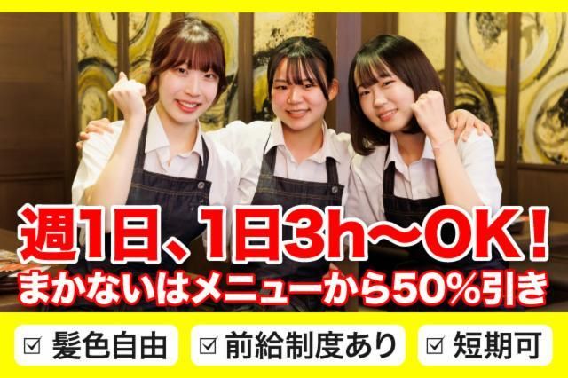 アピールメッセージ 履歴書不要♪新年バイトデビュー応援!週1・短時間OK、髪色自由&ネイルOK◎飲食未経験歓迎 大学生・主婦大歓迎!初バイトorパートも応援★テスト週間や家庭都合のシフト調整可◎入社時期相談OK&便利な前給制度あり