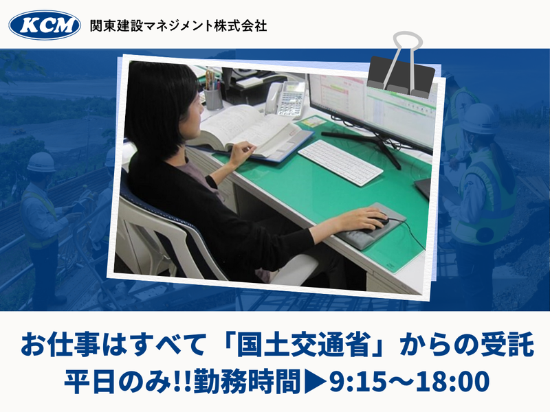 仕事内容 仕事は全て【国⼟交通省】からの受託❗ ”道路工事の積算業務”の募集です。 ◤ ̄ ̄ ̄ ̄✨ここがポイント✨ ̄ ̄ ̄ ̄◥ ✅ 資格・経験に応じて給与反映あり! ✅ 資格取得支援あり!キャリア形成も◎ ✅ 国の受託なので安定性・公共性が高い! ✅ 賞与年2回+各種手当がしっかり充実♪ ✅ 月20時間程度の残業でメリハリ勤務。 ✅ 年間休日128日!休みやすい環境。 ◣__________________◢ 国土交通省 大宮国道事務所から受託した業務 として、道路工事の発注に必要な工事費を 算出する積算業務を行っていただきます。 設計図や仕様書をもとに 材料費などを積算し総工費を計算する デスクワークが中心の業務です。 【具体的な業務内容】  ̄ ̄ ̄ ̄ ̄ ̄ ̄ ̄ ̄ ̄ ■積算システムを使用したデータ入力 ■工事発注図面および数量総括表の確認 ■工事発注者との打ち合わせ ■積算に必要な現地調査 ☎ 気になった方はまずはお電話を! TEL:048-638-0772 【1日のお仕事の流れ例】  ̄ ̄ ̄ ̄ ̄ ̄ ̄ ̄ ̄ ̄ ̄ ̄ ⏰08:30 始業・メールチェック スケジュール確認 ⏰09:00 専用システムに打ち込み ⏰12:00 お昼休憩 ⏰13:00 打ち合わせ 進捗状況の確認 ⏰14:00 専用システムに打ち込み ⏰17:15 終業 ⭐.。。. 自社で働くメリット .。。.⭐  ̄ ̄ ̄ ̄ ̄ ̄ ̄ ̄ ̄ ̄ ̄ ̄ ̄ ̄ ̄ ̄ ̄ ̄ ̄ ●国交省受託業務ならではの安定性! 社会インフラを守るための重要業務。 需要が安定しており、 社会貢献度も高い仕事です! ●ワークライフバランスを重視した職場環境 年間休日128日 × 完全週休2日制! 充実した休暇制度で、 有給休暇が取得しやすい環境です。 ●経験・資格に応じたキャリアアップを実現 資格取得支援や報奨金あり! キャリアアップを実現できます。 ●充実した福利厚生 年間2万2000円ライフプランサポート金や ベネフィットステーション加入、 ホテルやレジャー施設の割引など 福利厚生が充実! _/_/_/_/_/_/_/_/_/_/_/_/_/_/_/_/_/_/ \✨性別問わず幅広い年代が活躍中✨/ 福利厚生や各種手当も充実しているため 「前職より働きやすい」 「家庭との両立ができる」 といった声も多数あります。 ワークライフバランスを保ちながら 培ってきたスキルを存分に発揮できる環境で あなたもお仕事しませんか?