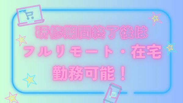 時給1,400円以上 給与 時給1,400円〜 交通費全額支給 ※研修中は時給1200円 ※入社後研修期間は出社勤務となります。その後はフルリモート勤務可能です。 ※研修期間は習熟度によって変更します。3カ月程度で習得し独り立ちするスタッフが多いです!