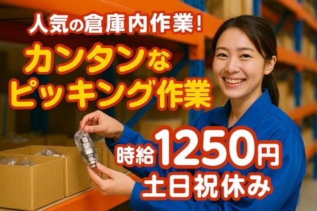 仕事内容 ■ 油圧パーツのピッキング・仕分け・箱詰め\男女活躍中!/ <お仕事内容> 倉庫内で油圧機器に使われる小型パーツを扱う軽作業です。 マニュアル完備&丁寧な研修があるので、未経験の方も安心してスタートできます! ◆ ピッキング作業 ハンディ端末や伝票を確認して、棚から必要な部品を取り出します。 ◆ 仕分け作業 集めた部品を品番ごとに分けて数量チェック。モクモク作業が好きな方にピッタリ! ◆ 箱詰め・出荷準備 仕分けたパーツを箱に詰め、ラベルを貼って出荷の準備をします。 ◎ すべて軽量部品だから体への負担も少なめ♪ 整理整頓された清潔な倉庫で、快適に作業できます。 ■このお仕事のポイント ◎ 安定収入!高時給1,250円! 軽作業でもしっかり稼げるのが魅力◎ ◎ 土日祝休みでプライベート充実! 週末は家族との時間や趣味をしっかり楽しめます♪ ◎ 未経験OK・丁寧なサポート体制 先輩スタッフがしっかりフォロー!安心して始められます。 ◎ 幅広い年代が活躍中! 20代~50代まで男女スタッフが活躍中!落ち着いた職場環境です。