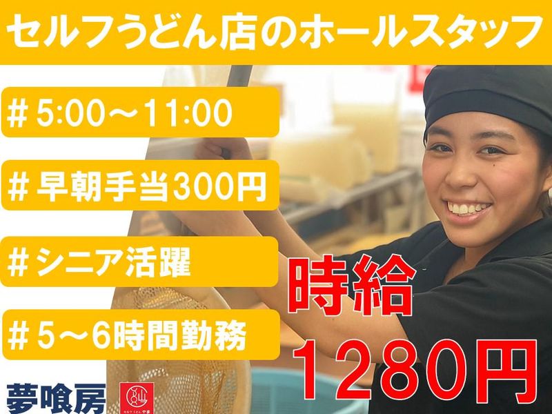 仕事内容 《仕事の内容》 セルフうどん店の早朝勤務スタッフ♪ タクト敷地に内にある朝から人気チェーン【セルフうどんやま】で 一緒に楽しく働きましょう\(^o^)/♪ ~朝イチの業務内容~ ◆店舗前の看板やのぼりを出す ◆テーブルの上の台拭きや水の入ったピッチャーを準備する ◆ねぎ、大根おろし等の薬味の準備 ◆いなり寿司、おにぎりの準備 ◆だし巻き玉子の準備 ◆トッピングの肉(肉うどん用)の準備 ◆天ぷらの準備 ◆レジの開店準備 ◆出汁の調合、仕込み、再加熱など ~開店後~ ◆レジ対応、接客 ⇒レジ対応と並行して天ぷらの調理を行って頂きます。 ◆洗い場 ⇒お客様が利用後の食器を食洗器にセットし、片付ける うどんを茹でたり、トッピングの材料を切ったりなど、レシピやマニュアルに基づいた シンプルな作業ですので、未経験の方でも安心✨早起きが得意な方、午前中だけ働きたい方にピッタリ♪ 7:30開店のため、それまでは開店前準備、開店後は簡単な接客とお客様対応を行って頂くイメージです! 店内の様子やお客様への気配り・心配りを通して接客スキルもしっかり身に付きます! 調理スキルも身につけながら、ただ『勤めるだけ』でなく、自身の成長に繋がる職場♪ 業務についても先輩スタッフがしっかり優しくサポート! また入社後は本社からもお困りごと相談窓口を設けているのでバックオフィスからのサポートも万全! スタッフが安心して働ける環境を提供いたします(*^^*)