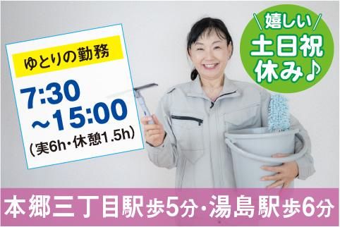 仕事内容 \安心の住友不動産特約店/ キレイな住友オフィスビル内! 共用部の簡単な日常清掃♪ ♡ゆとりの7:30~15:00/実6h ♡完全週休2日制▶土日祝休み 未経験の方も大歓迎♪ 親切指導で安心スタート♪ 30代~73歳/主婦・女性活躍中 【勤務地】 丸ノ内線・大江戸線 本郷三丁目駅/2番出口歩6分 千代田線 湯島駅/3番出口歩7分 (東京都文京区本郷3丁目) 【具体的には】 ・エントランス等の拭き掃き ・給湯ルームの清掃・ゴミ回収 ・トイレ・化粧台の日常清掃 ※時間帯により清掃箇所が異なります。 【勤務時間・曜日】 7:30~15:00/実6h・休1.5h ※休憩/午前30分・昼60分有 ★月~金曜/週5日(祝休) 【休日・休暇】 完全週休2日制♪ 土・日・祝日・GW・年末年始 ※年間休日120日以上 ✅難しい作業や重い機材使用なし ✅ビル内は冷暖完備で通年快適 - 選ぶなら全国展開で躍進する 安定成長企業(株)コアズへ! -