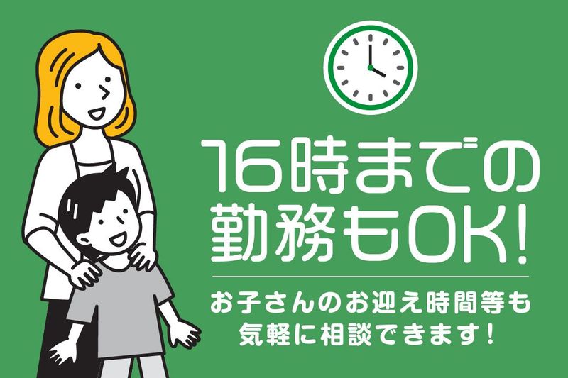 勤務時間詳細 10:00~19:00(平日のみ) ◎週4日、1日6h~OK ◎16時まで勤務等もOK! ◎平日のみの勤務!土日祝休み ◎いつでも相談・変更OKな 固定シフト制 シフトは都合に合わせて調整可能 子供の発熱や学校行事など、 急なお休み等も柔軟に対応します。