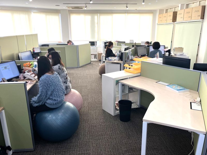職場環境 名鉄「青山」駅より徒歩5分 車通勤もOK! 新しい広々としたオフィスで 机なども新しく、椅子はバランスボールです。