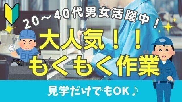 仕事内容 【駅チカ×日勤×シンプル作業】未経験でもできる金属部品の穴あけ・塗装スタッフ♪ \ ほとんどの方が未経験スタート!覚えやすく続けやすい人気職 / 【仕事内容】 ? アルミ部品の穴あけ作業 ・円柱状のアルミを機械(ボール盤)にセット ・決められた位置に穴をあけるだけ!操作はとても簡単です ? マスキング作業 ・塗装しない部分にテープを貼るだけのシンプル作業 ・黙々と進められるので集中しやすい♪ ? 刷毛での部分塗装 ・テープで保護した部分に刷毛でサッと色塗り ・細かい技術は不要!丁寧に塗れれば大丈夫◎ 【ここがポイント!】 ◎ とにかく作業が簡単で覚えやすい ◎ 駅チカで通勤ストレスゼロ ◎ 日勤専属で生活リズム安定 ◎ コツコツ作業・モクモク作業が好きな方に大人気 ◎ 未経験でも安心のフォロー体制あり \ まずは軽い気持ちでOK!未経験の方も大歓迎です / ご応募お待ちしています♪ 求人コード:7035