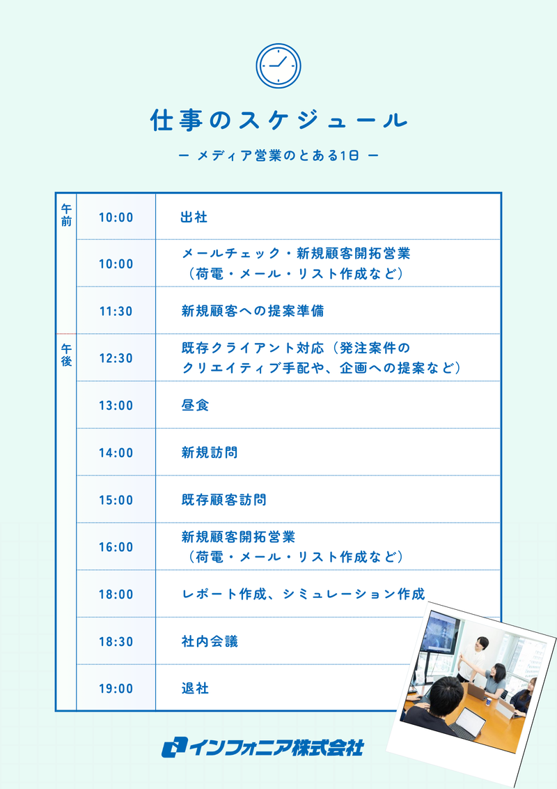 仕事内容 20年以上続く日本最大級のサイトをさらに 成長させるために、長く一緒に働ける方を募集中です! <求人のポイント> *30代中心に男女共に活躍中の職場! *定着率◎!勤続10年以上の社員多数! *オフィス勤務とリモートを併用 *フレックス&土日祝日休みの完全週休二日 *残業少なめ!年間休日130日 - 【仕事内容】 当社運営の日本最大級の懸賞サイト 「チャンスイット」や「みんなのランキン グ」等メディアの広告枠を売る営業をメインにお願いします! ①純広告の拡販 企業様に自社メディアが保有する広告枠 (純広告)をご提案 ②自社メディアの拡販 懸賞を実施する企業様に当社が運営する ポイントサイトなどへの掲載をご提案 〈このポジションの魅力〉 日本最大級の自社メディアを運営しているからこそ、自分自身の提案が多くのユーザーに届く面白さがあります。 また、インバウンドや既存顧客がメインのた め、すでにサービスに関心をお持ちのお客様 がほとんど。 強引なアプローチや、数字だけを追いかける ような提案ではなく、顧客の課題にじっくり 向き合いながら顧客との信頼を深めていくことができます。 - <入社後の流れ> ご経験に応じたOJT研修を実施。 主に営業の流れや手法について知見を深めて いただき、徐々に商談などをお任せします。 最初は営業以外の業務も知っていただくため 自社メディアや広告の運用、制作などの業務 を体験しながら、自社の全体像を把握いただきます。 - <自社運営サービスをご紹介!> 当社はメディア事業、アフェリエイト事業、 広告代理事業、ソリューション事業を軸に 様々なサービスを提供しています! ◇チャンスイット サービス開始から20年以上の 懸賞&アンケート回答でポイントを 貯められるサービス https://www.chance.com/ ◇みんなのランキング ユーザー参加型のランキングサイト https://ranking.net/ その他のサービスはHPをご覧ください! ▼https://www.infonear.co.jp/service/ - <職場環境について> 社内の男女比は半々で、平均年齢は37歳。 定着率も良く、在籍10年以上の社員も多数! 残業月平均6時間と働きやすい環境が魅力! 弊社のリモートワーク利用基準を満たした 場合、週1~3日程度在宅勤務の利用が可能! ※業務の状況に合わせて、在宅と出社を柔軟に使い分けています。 働く社員のインタビューを ぜひご覧ください!! ▼https://www.infonear.co.jp/info-cat/interview/ -