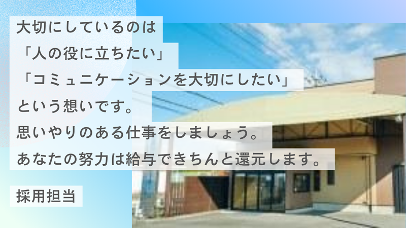 求めている人材 ■要普通自動車免許 業界・職種未経験の方歓迎! 「人のためになる仕事がしたい方」 「気配りや気遣いができる方」 「人とのかかわりを大切にしている方」 「仕事でやりがいを感じたい方」 そんな方にオススメのお仕事です。 *-* 【こんな方は特に歓迎します】 ご家族や参列者の方と接する時間が多い為、 相手の言葉を丁寧に受け取り、 落ち着いてコミュニケーションが 取れる方を歓迎いたします。 何気ない一言や気遣いが ご遺族の安心につながるため、 「人と話すことが好き」 「相手に合わせて会話ができる」 という方が活躍しやすい環境です。 *-* ◎インタビュー◎ 当社では、前職がホテル従業員だった方、 物流業をされていた方、飲食店で働いていた方等、 様々な業界から転職してきたスタッフが活躍しています。 大切にしているのは「人の役に立ちたい」 「コミュニケーションを大切にしたい」という想いです。 思いやりのある仕事をしましょう。 あなたの努力は給与できちんと還元します。 採用担当