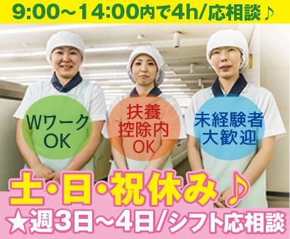 シフト制 勤務時間詳細 【勤務時間・曜日】 9:00~14:00の間で4h ★月~金曜内で週3日~4日シフト制 (シフトについては応相談♪) ◆土・日・祝日・GW・年末年始休み ◆扶養控除内OK♪