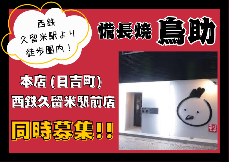 仕事内容 西鉄久留米駅近くにある本格炭火焼鳥と備長焼が 自慢の焼鳥店での調理・接客全般をお任せします。 経験をお持ちの方は、即戦力として活躍していただけます! 〇 具体的なお仕事内容は・・・  ̄ ̄ ̄ ̄ ̄ ̄ ̄ ̄ ̄ ̄ ̄ ̄ ̄ ̄ ̄ ̄ ̄ ̄ ̄ ・串打ちなどの仕込み ・焼き場 ・一品料理の調理 ・洗い場、接客 など 〇 久留米でも人気の焼鳥店  ̄ ̄ ̄ ̄ ̄ ̄ ̄ ̄ ̄ ̄ ̄ ̄ ̄ ̄ ̄ ̄ ̄ ̄ ̄ 久留米にある「本格炭火焼鳥 備長焼 鳥助」は 久留米でも人気の焼鳥と居酒屋メニューを提供するお店です。 個室も完備されており美味しい焼鳥が楽しめることで評判のお店。 2022年には「西鉄久留米駅前店」の2号店もOPENしました。 今回は「契約社員」として社員スタッフのサポートをしながら頑張ってくれるの募集です。 串打ちから焼き場までイチから丁寧に指導していきます! 学べることの多い職場ですので、飲食業界に興味があって、 「挑戦したい」「やってみたい」という気持ちがある方に最適の環境です。 〇 駅チカの2店舗で同時募集 !  ̄ ̄ ̄ ̄ ̄ ̄ ̄ ̄ ̄ ̄ ̄ ̄ ̄ ̄ ̄ ̄ ̄ ̄ ̄ ◆本店 福岡県久留米市日吉町24-14平川ビル1F (西鉄「久留米」駅より徒歩7分) ◆西鉄久留米駅前店 福岡県久留米市東町38-37岩崎ビル1F (西鉄「久留米」駅より徒歩2分) 〇 「鳥助」オススメポイント!  ̄ ̄ ̄ ̄ ̄ ̄ ̄ ̄ ̄ ̄ ̄ ̄ ̄ ̄ ̄ ̄ ̄ ̄ ̄ ◆POINT(1) 当店はアットホームな雰囲気のお店なので お客様とのコミュニケーションも楽しみのひとつ。 笑顔で接客することでお客様に喜んでもらえることもあります。 ◆POINT(2) 焼鳥の調理スキルを磨くことが出来ます。 様々な部位の焼き方や調味料の使い方を学ぶことで 調理の幅が広がります。 ◆POINT(3) 仲間と協力してお店を盛り上げることで ヤリガイを感じることが出来ます。 ◆POINT(4) 自慢の焼鳥を通じてお客様に美味しい料理を提供することで 満足感を得られます。