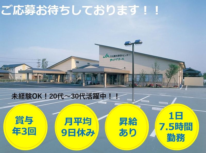 仕事内容 ✨定年退職後のお仕事を探されている方必見!! ✨安定・安心のJAグループでの勤務♪ ✨昇給・賞与もあって収入も安定! ✨月平均9日休みでプライベートも充実★ ✨残業も少な目!基本定時退社! ✨明るく元気な職場!! 30代~50代の男女が活躍中♪ 長く働ける環境です◎起業当初から のスタッフも多数在籍! <仕事内容> ――――――――――――――――――― 組合員や地域の方々,ご遺族の気持ちに 寄り添いながら安らかなる旅立ちのお手伝 いをさせていただきます。 通夜式・葬儀式全般の運営をお任せ いたします。 ✅通夜・葬儀の打ち合わせ ✅祭壇や供花等の受発注 ✅式場設営 など <未経験でもOK!> ――――――――――――――――――― 式に関わる事前準備や片付け等はスタッフ 全員でフォローします。 研修中はもちろん日頃の業務は先輩スタ ッフによる丁寧な指導やサポート、わから ない事は何でも相談できる環境です。 <こんな方にオススメ!> ――――――――――――――――――― 「人を喜ばせる事が好きな方」 「人と話す事が好きな方」 「落ち着いてきたから自身の為に 稼ぎたい方」 そんな方にピッタリな環境です。 現在は30代~50代の男女が活躍しており 無理なく働くことが出来ています。