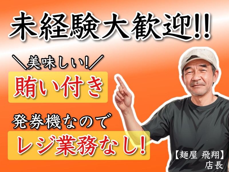 仕事内容 ╭━━━━━━━━━━╮ ◤ ここがPOINT! ◢ ╰━━━━━━━━━━╯ ✨ 高校生も活躍中! ✨ バイトデビュー・未経験OK◎ ✨ 履歴書不要/面接1回だけ ✨ 友達と一緒に応募OK! 「初めてのバイトで不安…」 そんな方も安心してスタートできます♪ === 【 お仕事内容 】 つくばで人気のラーメン店 『麺屋 飛翔』でのお仕事です♪ ❶ ホール業務 ・お客様のご案内 ・料理の配膳 ・片付け など ❷ キッチン補助 ・盛り付け ・洗い物 ・簡単な仕込み補助 ▶”食券制”なので レジ業務ナシ!接客もシンプル◎ 最初は必ず 先輩が横について教えます! 分からないことはすぐ聞ける環境です◎ ╭━━━━━━━━━━━━━━━╮ ⭐バイトデビューでも安心!⭐ ╰━━━━━━━━━━━━━━━╯ ● 未経験スタートの高校生多数 ● マニュアルあり ● 優しい先輩がしっかりフォロー 「最初は緊張したけど、すぐ慣れた!」 そんな声もたくさん♪ ╭━━━━━━━━━━━━━━━╮ ⭐学生にうれしいメリット!⭐ ╰━━━━━━━━━━━━━━━╯ ✨ まかないあり/食事補助あり(何を食べても100円!) ✨ 土日祝は時給UP! ✨ 交通費支給 ✨ 車・バイク通勤OK ✨ 無料駐車場あり 学校帰り・部活後でも通いやすい◎