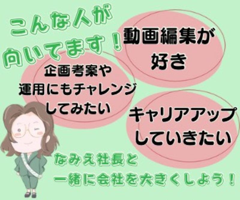 仕事内容: 動画編集スタッフ募集 SNS時代の最前線で活躍しませんか? 当社の求人サイトやSNSで配信する 動画コンテンツの制作・編集をお任せします。 撮影同行や撮影業務にも携わっていただき、 企画から公開まで一貫して関われるポジションです。 【 制作いただく動画内容】 YouTube向け:15分前後の横型動画 TikTok・Instagramリール向け:縦型ショート動画 それぞれの媒体特性を活かし、視聴者に響くコンテンツ制作を行います。 【具体的な業務内容】 ◎ 動画制作・編集・カット編集、 テロップ挿入、BGM・効果音の追加 ・使用ソフト:CapCut/Adobe Premiere Pro ※あなたのスキルや経験を活かしながら、 よりクオリティの高い映像制作を目指します。 ◎投稿前の最終チェック ・完成動画の品質確認 ・修正点の整理・改善提案 ・各プラットフォームへのアップロード ◎サムネイルデザイン制作 ・クリック率を高める魅力的なビジュアル設計 ◎ 企画考案・SNS運用 ・動画コンテンツの企画提案 ・トレンド分析をもとにした改善施策の立案 【この仕事の魅力】 ・編集だけでなく、企画や運用にも携われる ・SNSマーケティングの実践スキルが身につく ・自分のアイデアが形になり、数字として成果を実感できる ・クリエイターとしての可能性を大きく広げられる環境 「言われた通りに編集する」だけではなく、 “伸びる動画”を一緒に創る仲間を募集しています。 あなたのご応募をお待ちしております! ぜひ当社で作成・編集している動画もご覧ください! ◎TikTok https://www.tiktok.com/@namie_nagoya?_r=1&_t=ZS-94BpVN2QvpQ ◎Instagram https://www.instagram.com/namie_nagoya?igsh=MXc5eHB3YXZ2dHl1Mg%3D%3D&utm_source=qr
