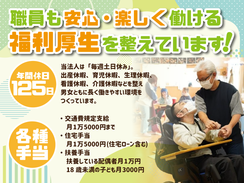 仕事内容 障がいのある方が安心して日常を 過ごせるように、生活全般をサポート するお仕事です。 利用者さんと一緒に過ごし、 笑顔を引き出すことが一番の役割。 支援というより「一緒に楽しむ」気持ちで 取り組んでいただけます。 ============ 【具体的な仕事内容は…】 ============ ◇利用者さんの日常生活の介助 (食事・トイレ・着替えなど) ◇健康チェックや安全の見守り ◇外出や行事の付き添い (公園散歩、買い物、地域イベントなど) ◇季節行事やレクリエーション企画・実施 (ゲーム大会や調理、制作活動など) ◇ご家族などとのコミュニケーション ◇送迎業務 施設内はいつも賑やかで、 スタッフも一緒に全力で盛り上がるのが特徴。 「今日はどんなことで笑わせよう?」 と考えながら働けるので、 日々やりがいを実感できます。 障がいに関する知識や経験がなくてもOK! 気になったらぜひ見学へお越しください。