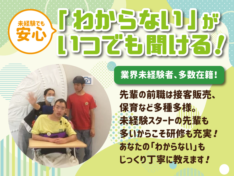 職場環境 ひとりで黙々…ではなく みんなで協力し合って チームで奮闘しています。 人が好きな方なら活躍間違いなし! <見学について> 利用者様との信頼関係が 何よりも大切だから 見学して「自分には無理」と 感じたら無理強いしません! ぜひ気軽に遊びに来てください。