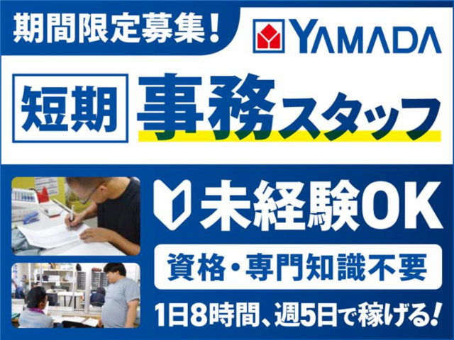 仕事情報 ● 仕事内容 事務系 期間限定アルバイト(3/1~) ヤマダデンキ配工(配送)センターでのお仕事です。 主に配工(配送)センター内での伝票作成 伝票等のデータ入力、電話応対等 をお願いします 具体的な仕事内容例 ヤマダデンキ配工センター(配送センター)内での 短期のお仕事です。 簡単な書類の整理、簡単なレジ操作など、端末へのデータの入力 コピー、FAXの整理、書類への押印などをお願いします。 (事務の専門知識は不要です) 力仕事なし!髪型自由! 事務のお仕事なので力仕事は基本的にありません。 髪型、髪色の指定なし(※業務の妨げにならない程度) ネイル可(※華美なもの、危険な長さのものは除く) 事務所内、休憩室は空調完備の為快適なお仕事です 服装自由ですが動きやすいものに限ります 1日の仕事の流れ(例) 出勤後、書類整理などの準備作業 その後端末への入力作業や伝票処理作業など
