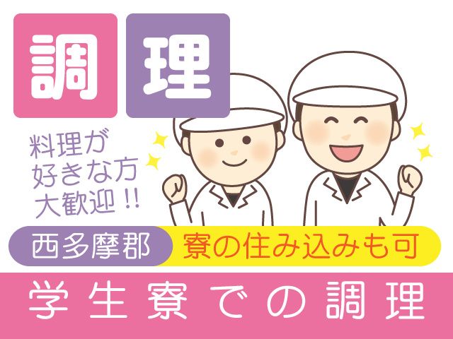 仕事内容 『ライフインフーズ株式会社』より 新規スタッフ募集! 【勤務地】 東京都西多摩郡日の出町(学生寮) 【募集職種】 業務委託/調理スタッフ <お仕事について> 学生寮での食事提供のお仕事です。 下ごしらえ、調理、盛り付け、洗浄、 厨房に関わる業務全般 等の業務です 普段の家事が活かせるお仕事ですよ! 未経験者大歓迎 料理好きな方大歓迎です <働くポイント&メリット> 【無資格・未経験OK】 調理業務の経験が無い方でも ご安心ください 【幅広い年代の方が活躍中】 主婦・主夫の方、中高年、 ミドル世代・シニア世代の方等 幅広い年代の方々が活躍中! 【こんな方は是非!】 ・寮住込みでできる方 ・週6日勤務できる方 ・料理が好きな方 ・調理に興味がある方 ・人の喜ぶ顔が好きな方 ・長期で働きたい方