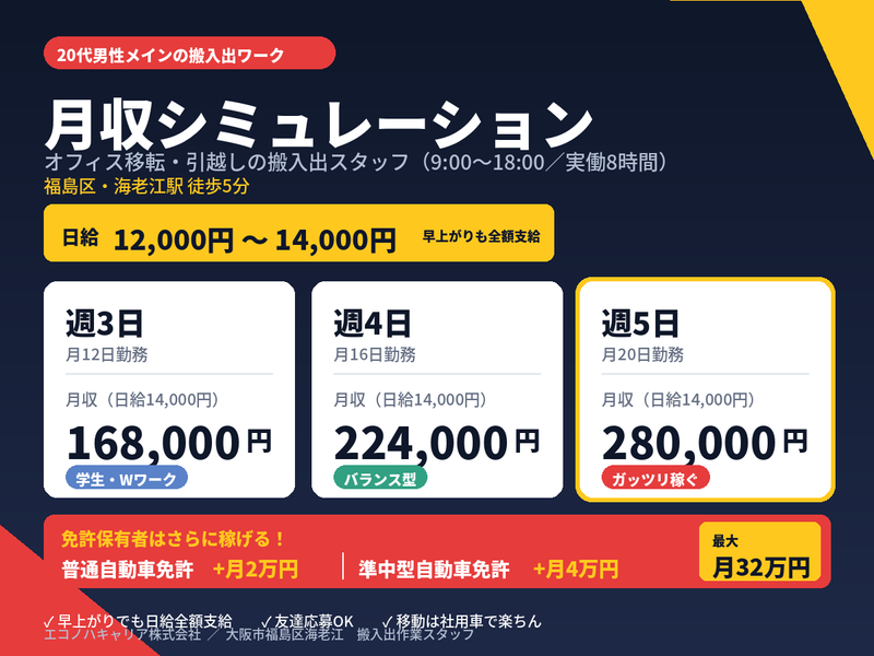 仕事内容 【急募!駅近】日給1.2万保障!早く終わっても全額支給👍 福島区の事務所までは駅ちかの徒歩5分! 現在、業務多忙につき【急募】を行っています! 「とにかく早く稼ぎたい」「体を動かす仕事がしたい」そんな若手スタッフが多数活躍中。 シンプルで分かりやすいお仕事です。 駅徒歩5分・髪型髪色自由・ひげOK ー 【お仕事の内容】 * オフィスの移転: 事務所のデスクやPC、オフィス家具などの移動をお手伝い。 * お家の引越し: ワンルームから一軒家まで、個人のお客様の荷物を運びます。 チームで協力して動くので、一人で抱え込む心配はありません! 安全な作業が中心なので、未経験の方も安心してスタートできます。 ー 【免許を持っているとボーナス有り♪】 ①普通自動車免許を持っている方 日給+1,000円 ②準中型自動車免許を持っている方 日給+2,000円 ー 【若手に人気のポイント!】 * 日給保障で安心! 現場が早く終わっても、日給はそのまま全額支給。効率よく稼げるのが最大のメリットです! * 移動時間は座っているだけ! 福島区の事務所に集合したら、社用車でみんなで現場へ。 * 即戦力を募集中! 積極採用中につき、すぐにお仕事を始めたい方を優先的にご案内しています。 *上記案件が無い日は別のお仕事を準備しているので安心♪(=日給保証) ー 【勤務地・集合場所】 * 集合: 福島区の事務所(ここから社用車で移動します) * エリア: 大阪府内を中心に現場多数! ー ◎搬入出作業が無い日もお仕事あります! ◎希望者は正社員登用あります! 【月収例】 ・週3勤務(月12日):14.4万円〜16.8万円(学生・Wワーク) ・週4勤務(月16日):19.2万円〜22.4万円 ・週5勤務(月20日):24万円〜28万円(フルタイム) ※普通免許保有でさらに+月2万円〜 ※準中型免許保有でさらに+月4万円〜