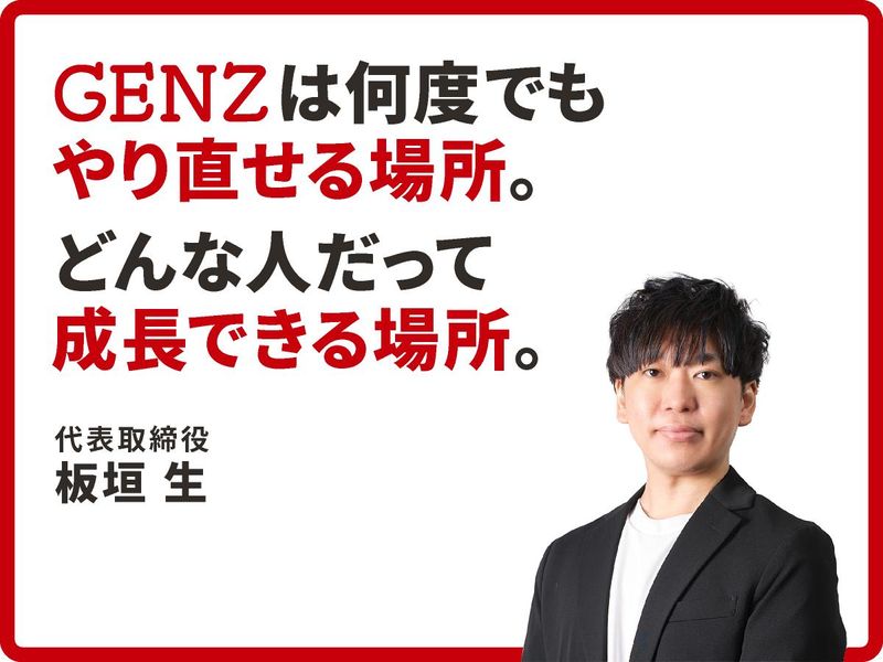 選考プロセス エントリー ▼ 書類選考 ※通過された方に 面接日などのご連絡いたします。 ▼ 面接(WEB面接可能) ※面接日時はご希望を考慮します。 ◎面接はお見合いの場だと思って 何でも遠慮なく聞いてください。 ▼ 内定 ※入社日は相談に応じます。 【HP】 https://genz.jp