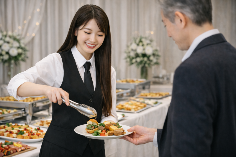 仕事内容 +―――――――――――・・・ <この求人のポイント> ■経験・スキル・専門知識不問 ■複雑な作業は一切なし ■OJT充実&チーム制で安心 ■気配り力&サポート力活かせる ■スキマ時間にコツコツOK ■Wワーク候補にも◎ ・・・―――――――――――+ <主な仕事内容> ■テーブルや会場のセッティング ■料理提供の準備(温め直しなど) ■料理、ドリンクの配膳 ■終了後の片付け、撤収 当社が用意したお料理を 冠婚葬祭やパーティー会場などで お客様に配膳するお仕事。 ガッツリお客様とお話ししたり ご案内することはありませんが、 気遣いやサポート力が喜ばれる お仕事でやりがいも◎ <こんなところがやりがい> ■「ありがとう」を直接もらえる ■毎回ちがう現場で新鮮 (都度、違う知識や経験が得られます) ■飲食業界で経験を積める etc. +―――――――――――・・・ <当社についてご紹介> 仕出し弁当から 大型ケータリングまで、 さまざまなシーンの 「食」を支えてきた当社。 埼玉県を拠点に20年以上、 地域の行事や式典に携わり、 「安心して任せられる」 と信頼を築いてきました。 料理だけでなく、 その場に合ったサービスや 気配りを大切にしています。 ・・・―――――――――――+