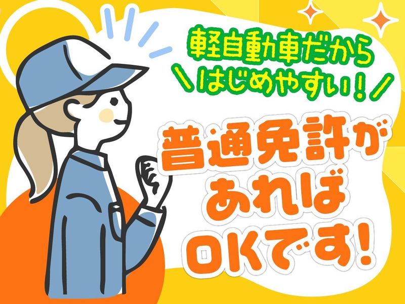 求めている人材 ★20代、30代、40代の女性活躍中! ●未経験歓迎 ●ブランク可 <必須> ★普通自動車第一種運転免許(AT限定可) ※軽自動車を使用します。 <歓迎> ●子育て・家事と両立できる仕事をお探しの方 ●運転が好きな方・得意な方 ●人との距離感を大事にしたい方 ●コツコツ・一人で作業するのが好きな方 ●体への負担を減らしたい方 ●新しい環境で挑戦していきたい方 スーパーコンビニといった接客・サービス業や 工場や倉庫内作業といったコツコツ作業など異業種からの転職も大歓迎です! 働くのが久しぶりというブランクがある方も歓迎します! 運転士や送迎、軽自動車ドライバーといった車を使うお仕事の経験がある方なお歓迎! 2tドライバー・4tドライバー・配送、配達、大型ドライバーなど運送業、ドライバー業務を活かして働けます♪ 性別の条件と理由:女性歓迎(ポジティブアクション)