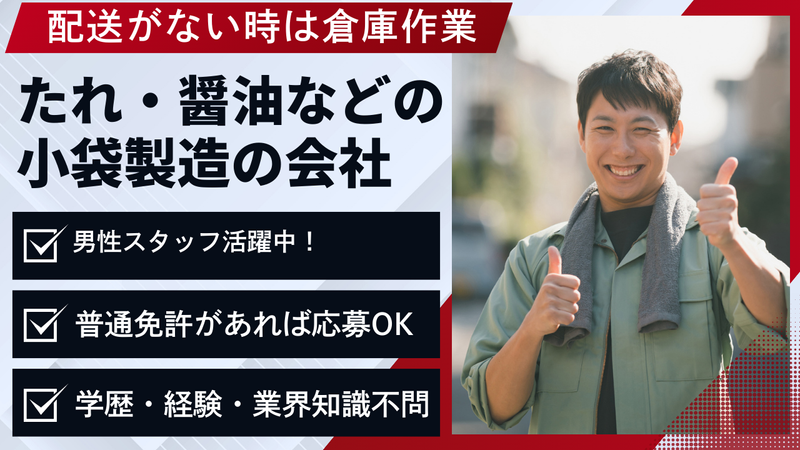 仕事内容 ▄▀▄▀▄▀▄▀▄▀▄▀▄▀▄▀▄ ✨未経験から“物流のプロ”を目指せる✨ ✨創業50年以上の安定企業で正社員募集✨ ✨倉庫管理×配送で将来につながるスキルを✨ ▄▀▄▀▄▀▄▀▄▀▄▀▄▀▄▀▄ 「たれ・醤油などの小袋」を製造している当社。 あなたには【倉庫管理業務】と【取引先への配送業務】を バランスよくお任せします。 普通免許があれば応募OK。 未経験からでも、段階的に仕事を覚えられる環境です。 【具体的な業務内容】  ̄ ̄ ̄ ̄ ̄ ̄ ̄ ̄ ̄ ̄ ̄ ̄ ̄ ■ 倉庫管理業務 ・商品の入出庫管理 ・検品、数量チェック ・倉庫内の整理整頓、在庫確認 ■ 配送業務 ・取引先への配送 ・夜間配送なし 【未経験でも安心の研修体制】  ̄ ̄ ̄ ̄ ̄ ̄ ̄ ̄ ̄ ̄ ̄ ̄ ̄ 入社後は先輩社員が丁寧にサポート。 最初は倉庫内作業を中心に、 商品知識や仕事の流れを覚えていきます。 慣れてきたら配送業務にもチャレンジ。 「できることを一つずつ増やす」育成スタイルなので、 物流業界が初めての方も安心です。 ◆働きやすさ・会社の魅力  ̄ ̄ ̄ ̄ ̄ ̄ ̄ ̄ ̄ ̄ ̄ ̄ ̄ ✨創業50年以上の安定企業 ✨正社員雇用で長期的に働ける ✨週休2日制でオンオフのメリハリ◎ ✨車・バイク通勤OK(無料駐車場あり) ✨昇給年1回、賞与あり 工場・倉庫内は整理整頓が行き届き、 落ち着いて作業に集中できる環境です。 ここまでお読みいただきありがとうございます。 少しでも気になった方は、 ぜひお気軽にご応募ください! あなたの新しいスタートを、 スタッフ一同お待ちしています。