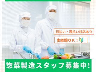 仕事内容 食品スーパーの物流センター内のお仕事です。 衛生管理の行き届いた工場でご飯を炊いたり、お惣菜を作る作業をお願いします。 各店舗で販売しているお弁当やおむすび・お寿司・煮物など最新鋭の機械を使って製造します。 特別な技術は必要ありませんが材料を入れたりと重量がある物を扱う作業があります。 ・初心者の方も大歓迎。 ・料理の経験が無くても大丈夫 ・重量がある物を扱う ・運搬作業あり