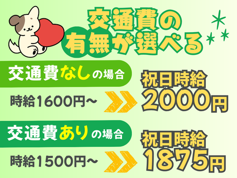 時給1,500円~2,000円 給与詳細 基本給:時給 1500円 〜 2000円 【交通費なしの場合】 時給1600円~ ⭐祝日時給2000円 【交通費ありの場合】 時給1500円~ ⭐祝日時給1875円 ※交通費ありの場合は全額支給(規定) ※昇給/昇格制度あり ※前給制度あり(規定あり) ※残業代全額支給(1分単位で計算)