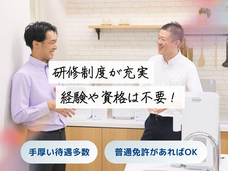 仕事内容 / 働き方の概念が変わる!? ストレスフリーで 自由な働き方を.・☆* \ . 業績好調!! 営業スタッフ増員募集♪ . ================= この求人のポイント♪ ================= ◆経験・スキル不問! <普通免許があればOK>です☆ ◆年間休日<120日以上!> ◆未経験も安心の<サポート体制完備♪> ◆<スーパーフレックス制>で 理想の働き方が実現♪ ◆ノルマはありません!! . . ================= 仕事内容はこちら! ================= . ✅サーバーメンテナンス  ̄ ̄ ̄ ̄ ̄ ̄ ̄ ̄ ̄ ̄ ̄ ̄ フィルター交換や作動チェックなど 既存のお客様先にて メンテナンスを行います! 1件40分ほどの時間が掛かるので お客様とのお話しを楽しみながら 作業をお願いします♪ 設置から修理まで、やり方は 研修でしっかりレクチャー! . ✅新規顧客対応  ̄ ̄ ̄ ̄ ̄ ̄ ̄ ̄ 電話やSNSからお問合せいただいた 新期のお客様先にて、 お客様の要望をヒアリングし 最適な機種のご案内を行います! . ✅設置・交換・撤去  ̄ ̄ ̄ ̄ ̄ ̄ ̄ ̄ ̄ ̄ ご契約されたお客様先にて ウォータースタンドの設置を行います! . . もちろん、 社用車や制服 タブレットや携帯電話などの 業務に必要なものは貸与! 設置方法や お手入れ方法のご説明などは 入社後にしっかり研修を行うので どなたもご安心くださいね♪ . . ================= 安心の<サポート体制!> ================= ◆入社後、まずは座学研修で 商品知識や訪問マナーなどを 基礎から丁寧にレクチャーします! . ◆座学研修後は、OJT研修で 先輩に同行し実際の現場を 学んでいただきます! . ◆独り立ち後も 階層別の勉強会や研修を実施♪ . 更に・・ 週に一度、 上長との面談を設けています。 ◎実務上のトラブル解決方法 ◎アドバイス・フォロー などなど・・ 些細なことから 相談できる環境が整っています♪ 安心してご応募ください☆ . . ============== <直行直帰>可能! ============== ご自宅から直接 お客様先へ訪問をし、 そのまま直帰OK! 勤務時間や休日は 自分で決められるので 週休3日の働き方も◎ フレックスタイム制ならではの 働き方が実現可能です♪ あなたが「働きやすい!」と思える ワークライフを見つけていきましょう! . . ============== 1日のスケジュール例 ============== 9時 自宅から出発! メンテナンスで3件訪問 12時 ランチタイム♪ 13時 新規のお客様先へ! しっかりヒアリングし、 お客様に合った機種をご案内♪ 15時 設置作業で2件訪問 17時 自宅へ直帰♪お疲れ様でした! . あるスタッフの1日の例ですが 上記のような働き方が可能です♪ . . =============== ウォータースタンドについて =============== 当社は、 「 2030年までに日本の 使い捨てプラスチックボトルを 30億本減らします。 」 というミッションを掲げ マイボトルを携帯する 新しい文化を創り、 気候変動とプラスチックによる 環境問題改善に取り組んでいます! . 一般のお客様だけでなく 官公庁や公共施設、 企業などのお客様からも 幅広く支持いただいております♪ このような信頼のもと 事業は右肩上がりで成長中! . ☆SNSでも話題のウォータースタンド☆  ̄ ̄ ̄ ̄ ̄ ̄ ̄ ̄ ̄ ̄ ̄ ̄ ̄ ̄ ̄ ̄ ̄ ̄ . // あなたのご応募を お待ちしております! \\